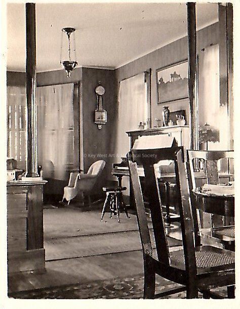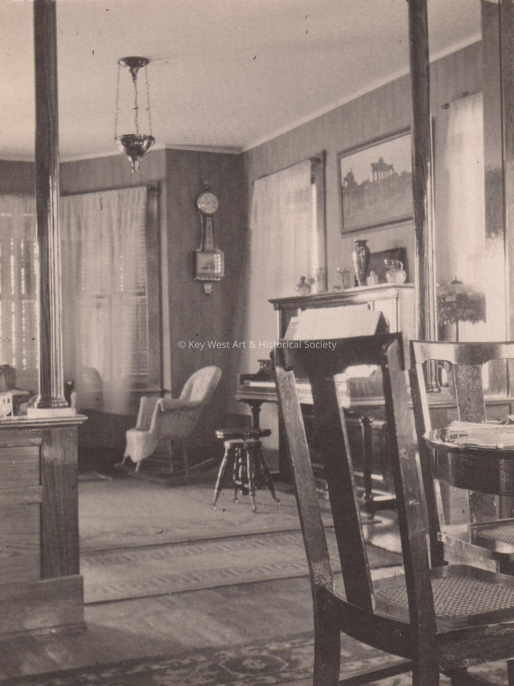 Black and white photograph of an unknown room, note on back reads "looking across the dining room into living room".