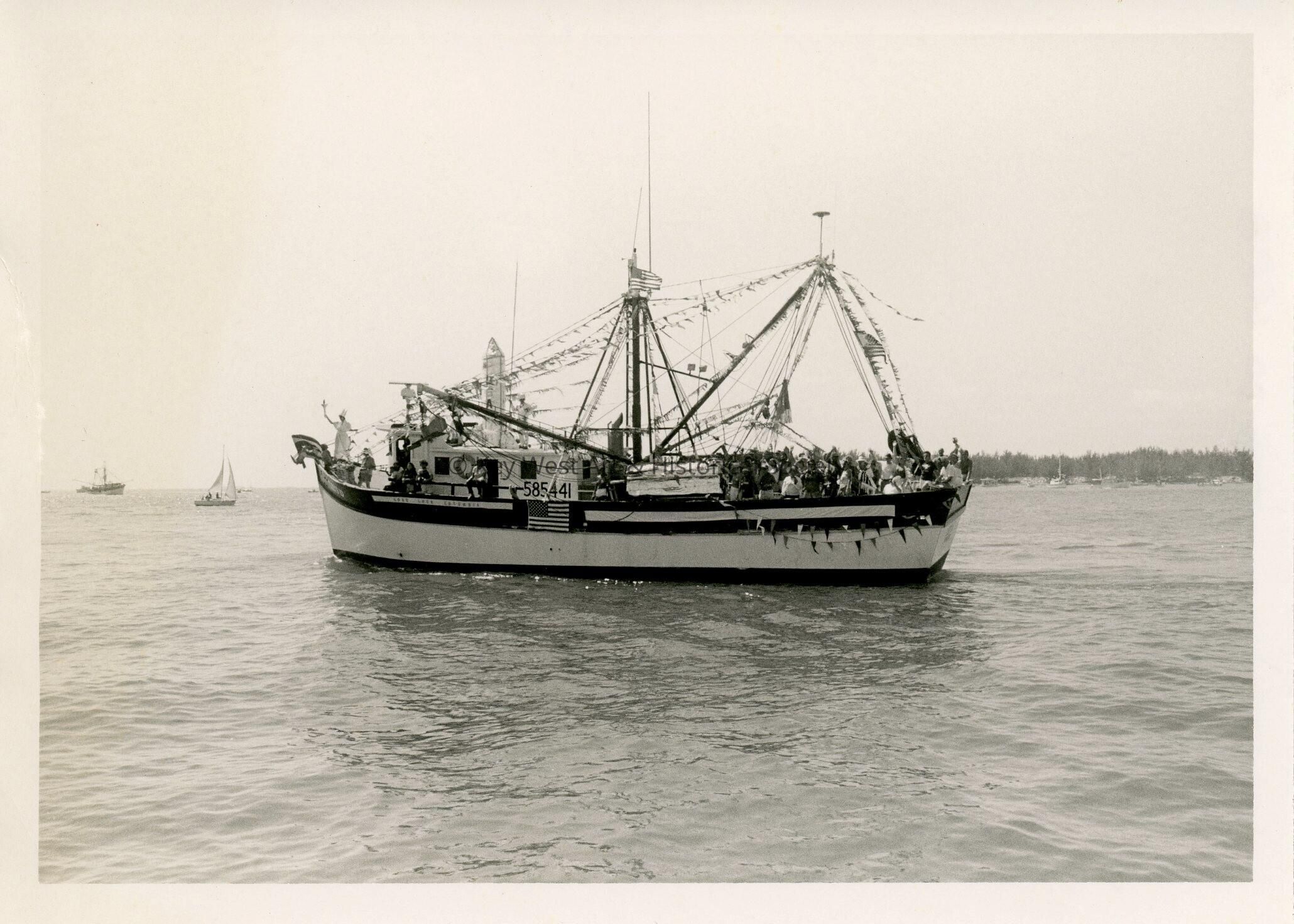 Black and white photograph of an unknown shrimp boat taken during the Blessing of the Fleet.Photograph Details