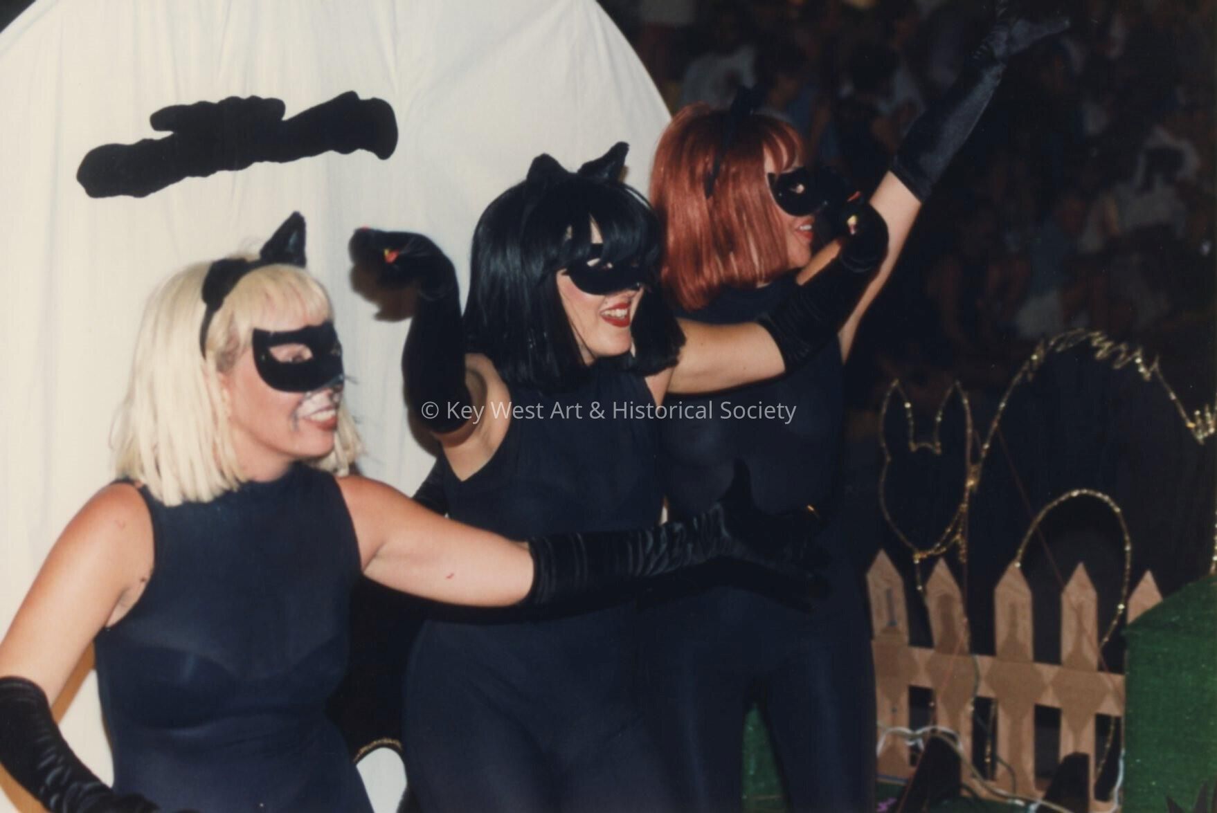 Unknown woman dressed up as black cats on a float.Entry/Object ID