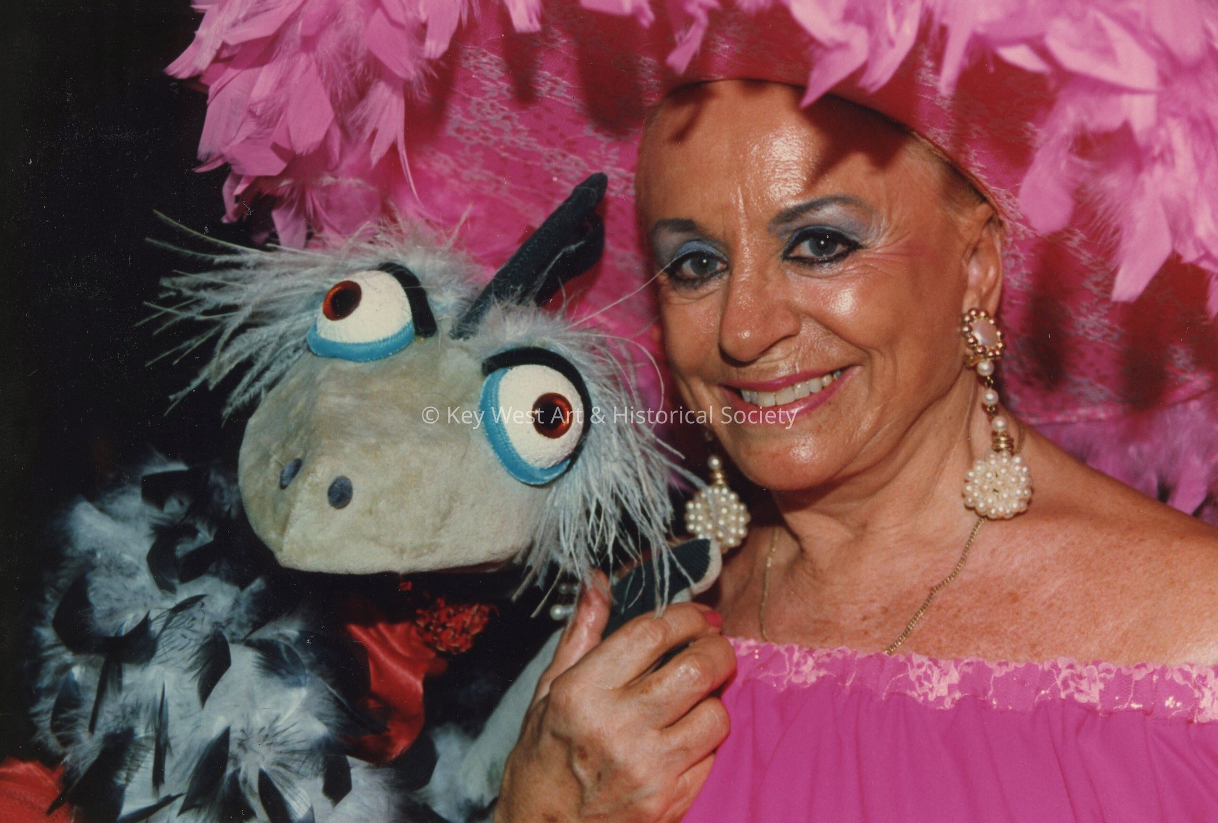 Unknown woman dressed up holding a puppet.