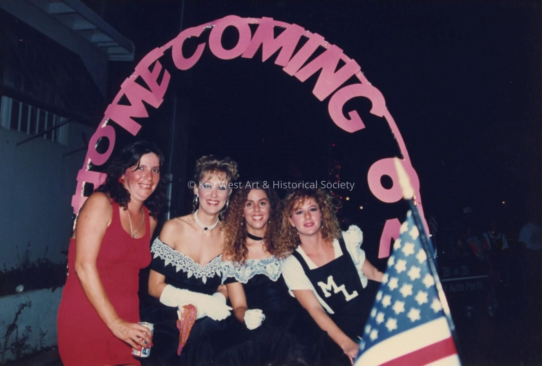 Unknown woman dressed up standing underneath a sign that reads homecoming.Collection