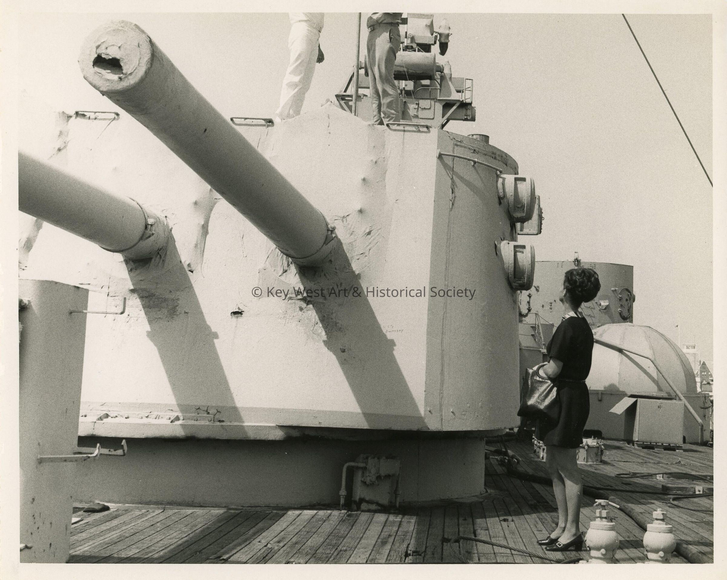 Unknown woman looking on as 2 unknown men in uniform are on top of a machine.Collection