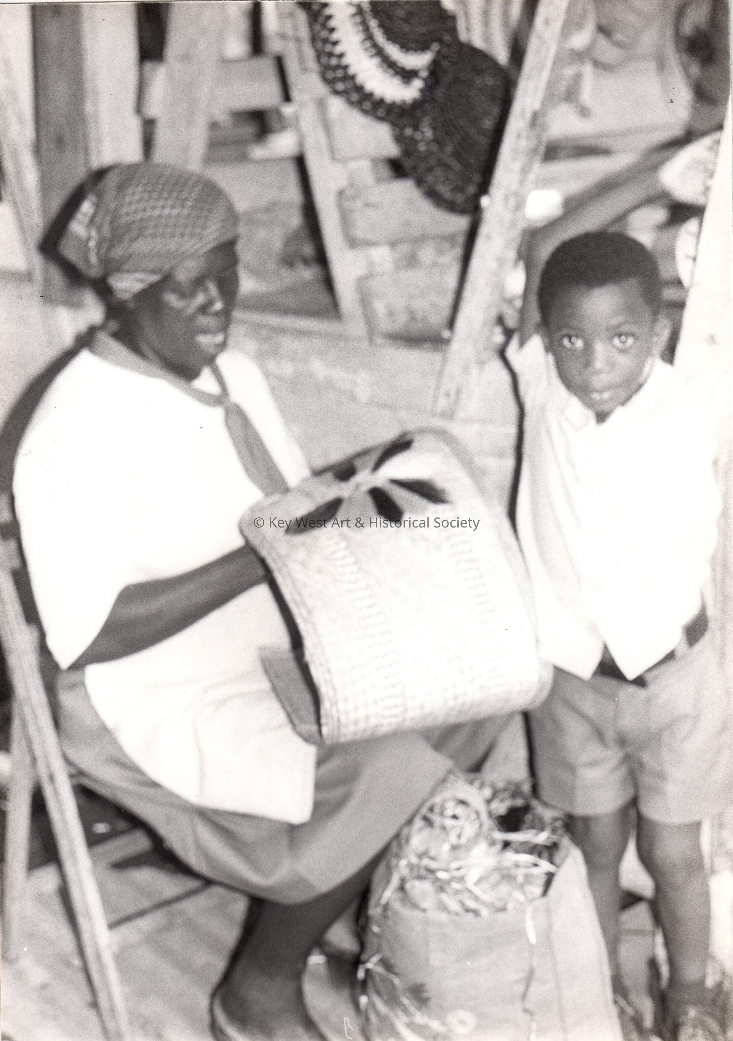 Young boy with a woman who is making a basket.