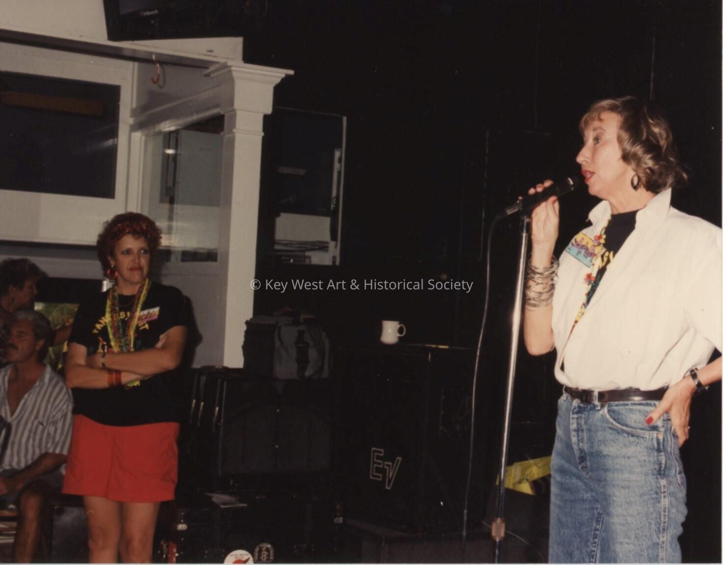 Unknown woman on a stage talking to a group of people.Entry/Object ID