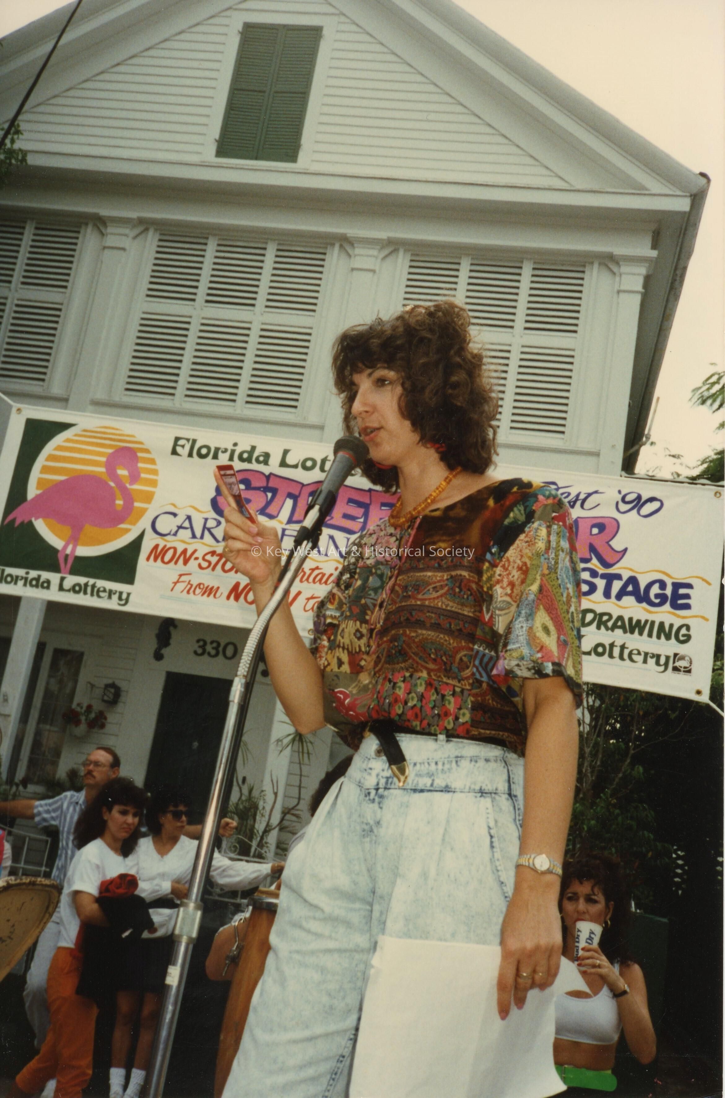 Unknown woman speaking on stage at the FF street fair.Collection