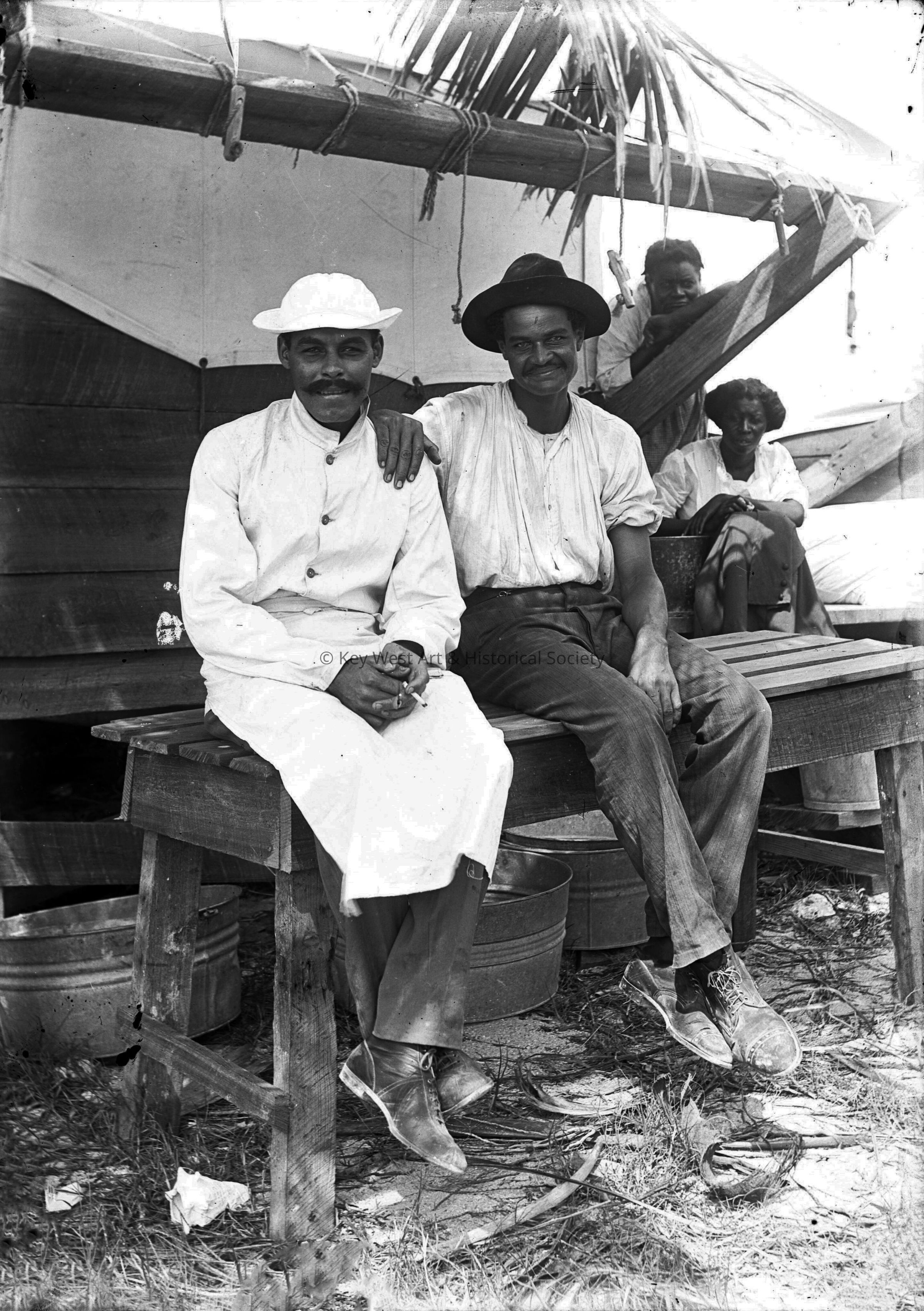 Black and white dry plate glass negative of four unknown workers (two men and two women) at the railroad camp on Pigeon Key. The image was taken during the construction of Seven Mile Bridge on the Overseas Railway.