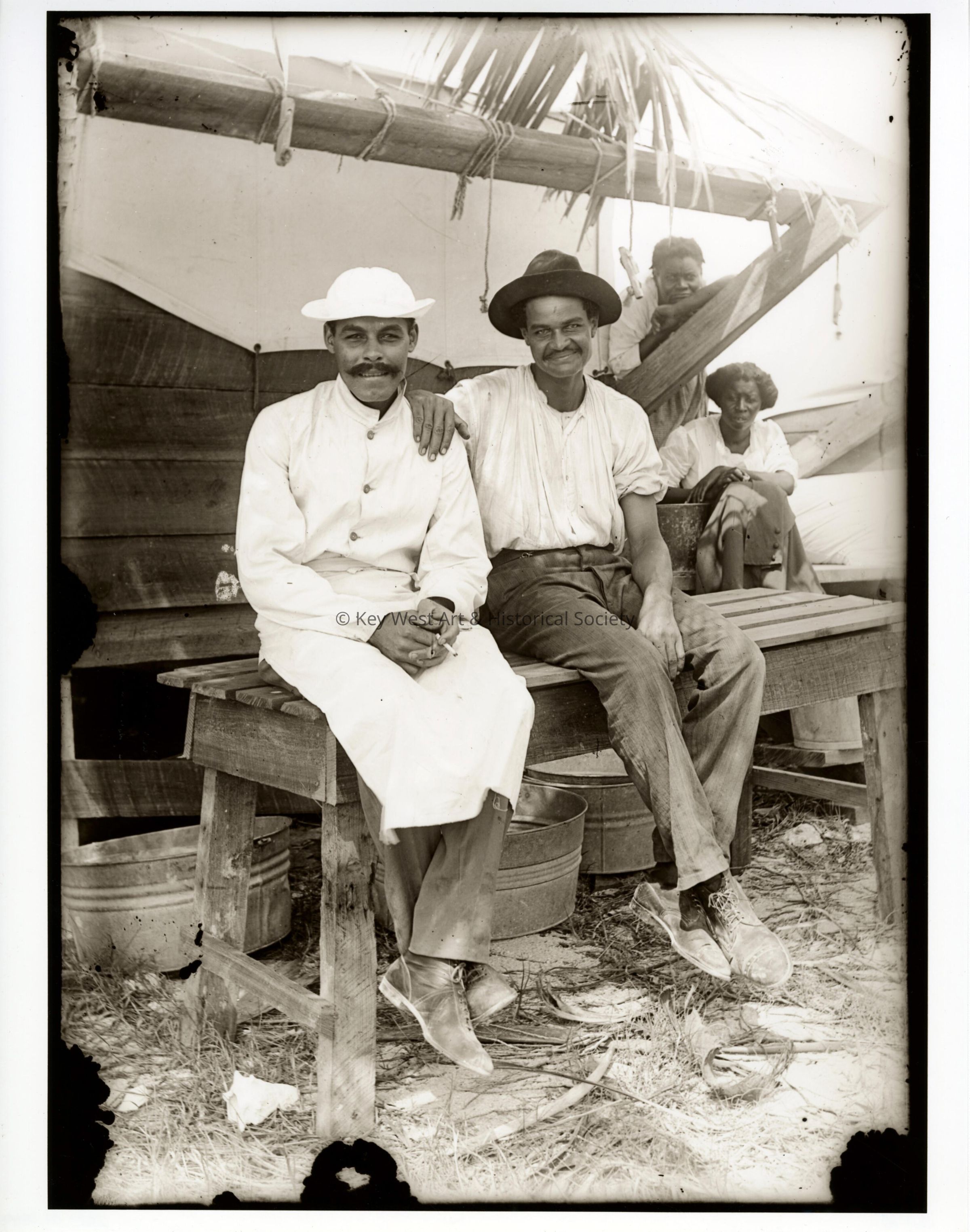 Black and white print taken from a dry plate glass negative of four unknown workers (two men and two women) at the railroad camp on Pigeon Key. The image was taken during the construction of Seven Mile Bridge on the Overseas Railway.