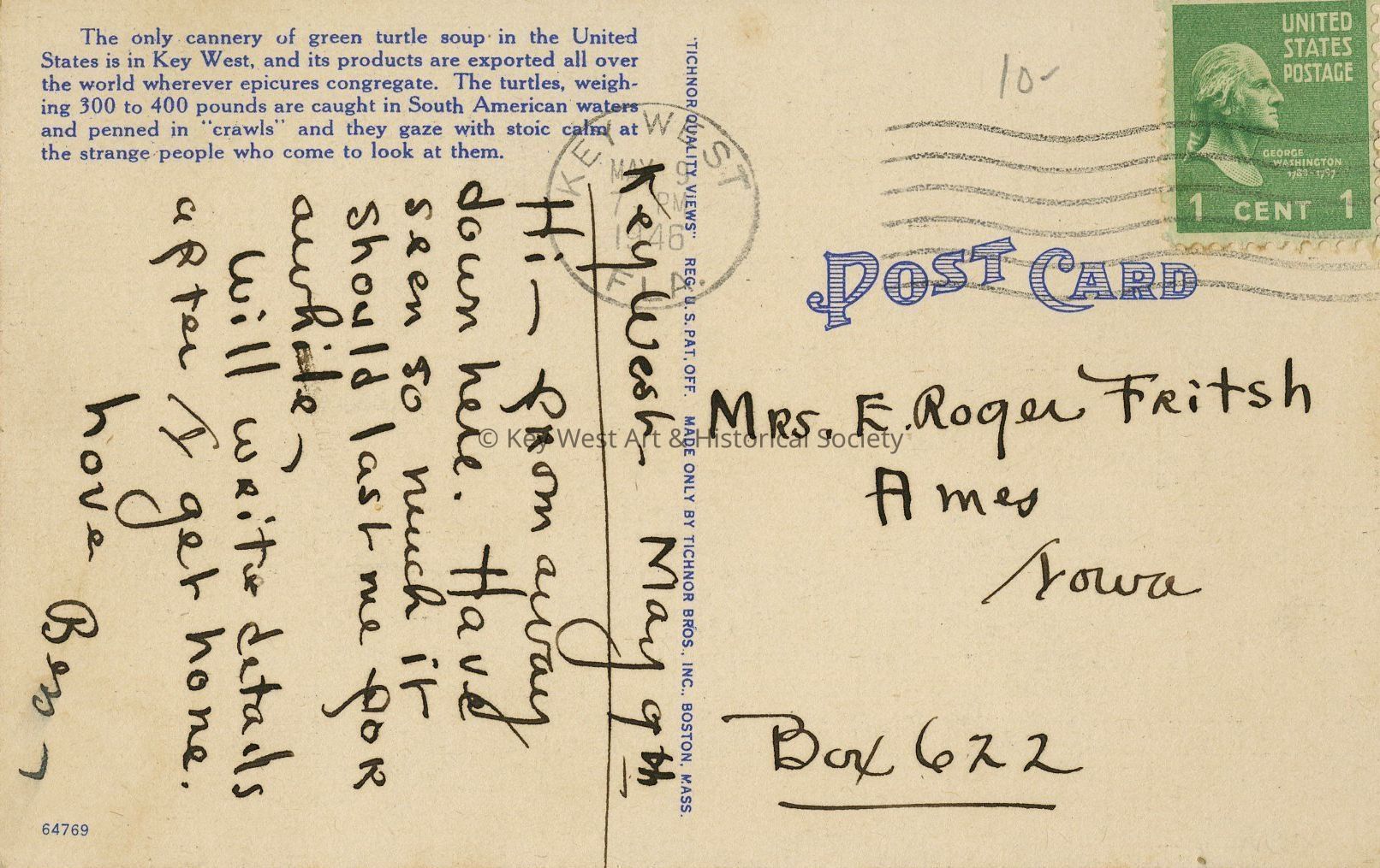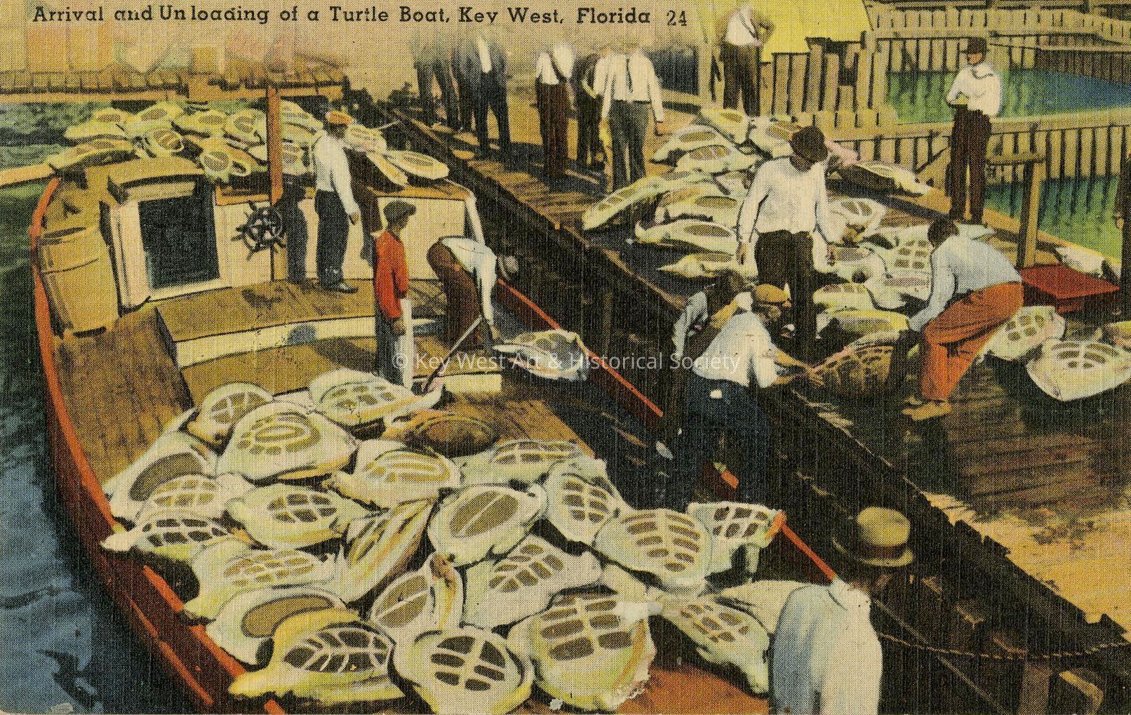 Postcard depicting arrival and unloading of a turtle boat, Key West, Florida. The only cannery of green turtle soup in the United States is in Key West, and its products are exported all over the world wherever epicures congregate. The turtles, weighting 300 to 400 pounds, are caught in South American waters and penned in "crawls" and they gaze with stoic calm at the strange people who come to look at them.Collection