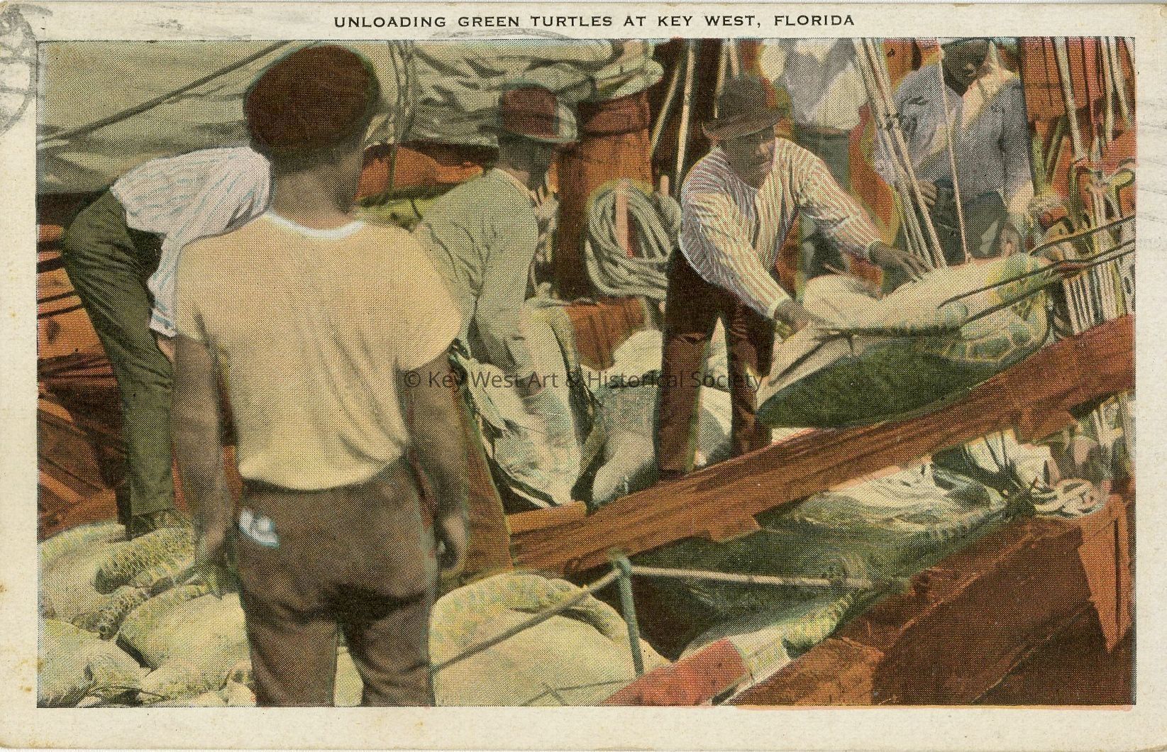 Postcard depicting unloading green turtles at Key West, Florida.Collection