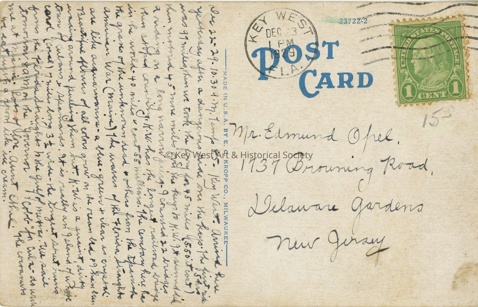 Arrived here yesterday after a dangerous ride onver the Keys. The first ride was 91 miles, then we took the ferry for 45 miles (5.50 it cost), then motored 45 more miles over the Keys to K.W. It seemed like a riding on a long narrow pier. I counted 22 bridges then stoped counting. K.W. has the longest railroad bridge in the world -- 40 miles & cost 55 millions. The cemetary here has the graves of the unknown dead & others fro the Spanish American War (Maine). The waves of the Florida Straights are like aquamarine -- a blue-green & clear as crystal. Beautiful flowers of all colors grow on the ocean bed & I have been wading around pulling them out. K.W. is a quaint, dirty town of Cubans & Spaniards. It is really an Island of White Corol (coral) 7 miles long 3 1/2 wide -- the longest street runs from the Florida Straights to the Gulf of Mexico. We sail tomorrow 8 a.m. on the "Governor Cobb" for Cuba -- Do write me at Miami. Lots of Love, Aunt Ethel. The cocoanuts we eat with a spoon like ice cream.Dimensions