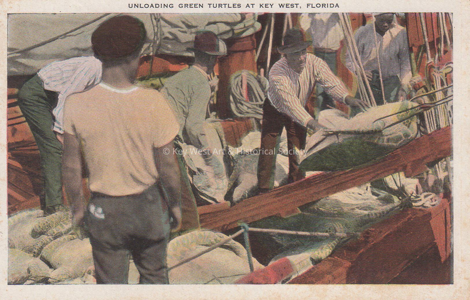 Postcard depicting men and turtles. The caption reads, ‘Unloading Green Turtles at Key West, Florida’.Subject Place