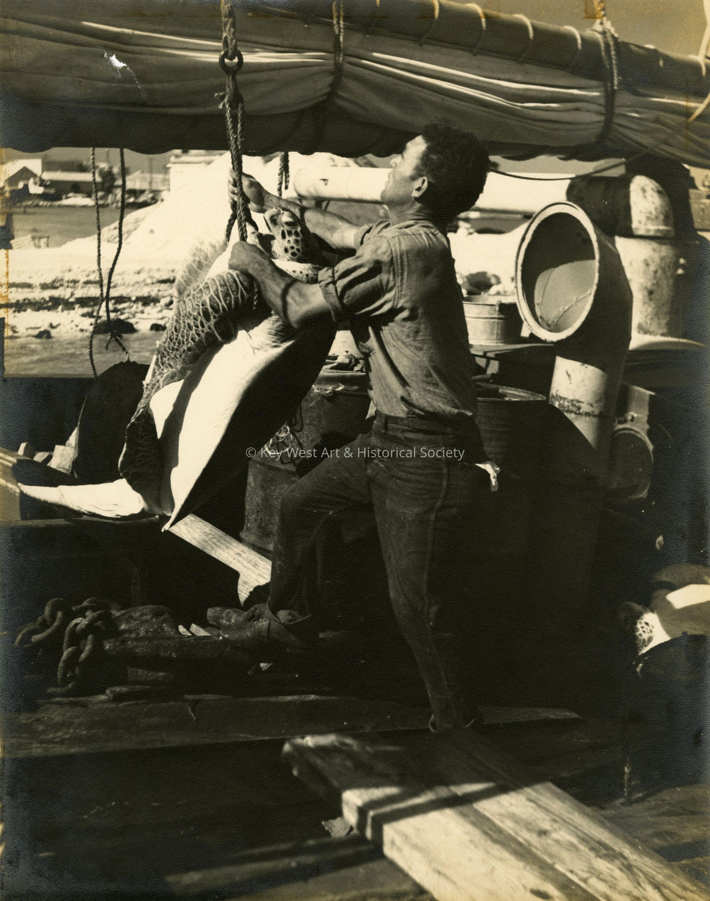 Black and white photograph of a man unloading a turtle from a schooner in Key West.