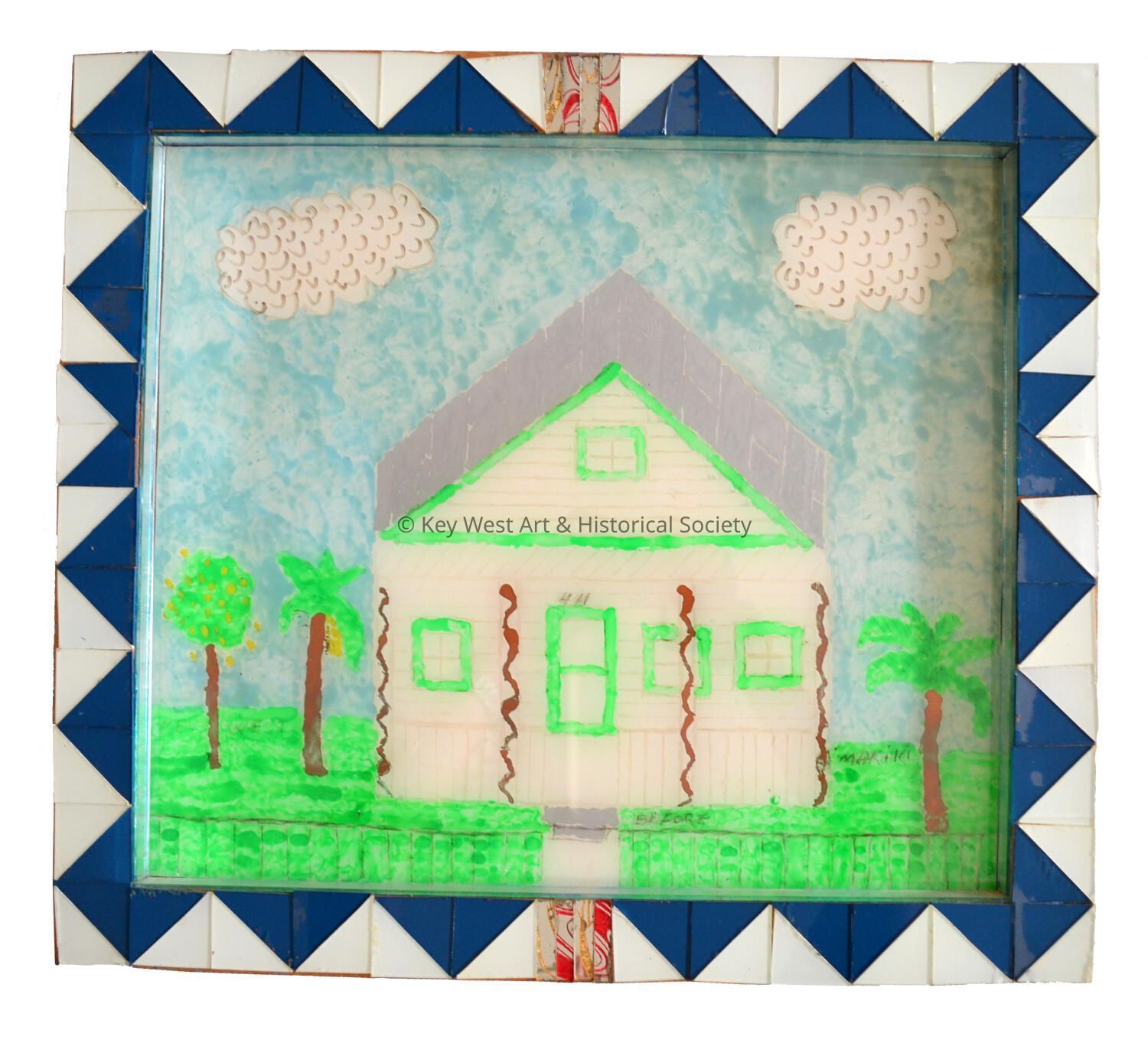 Painting of 411 Catherine Street, Key West by Makiki. Colored mosaic glass pieces glued around the frame.Collection