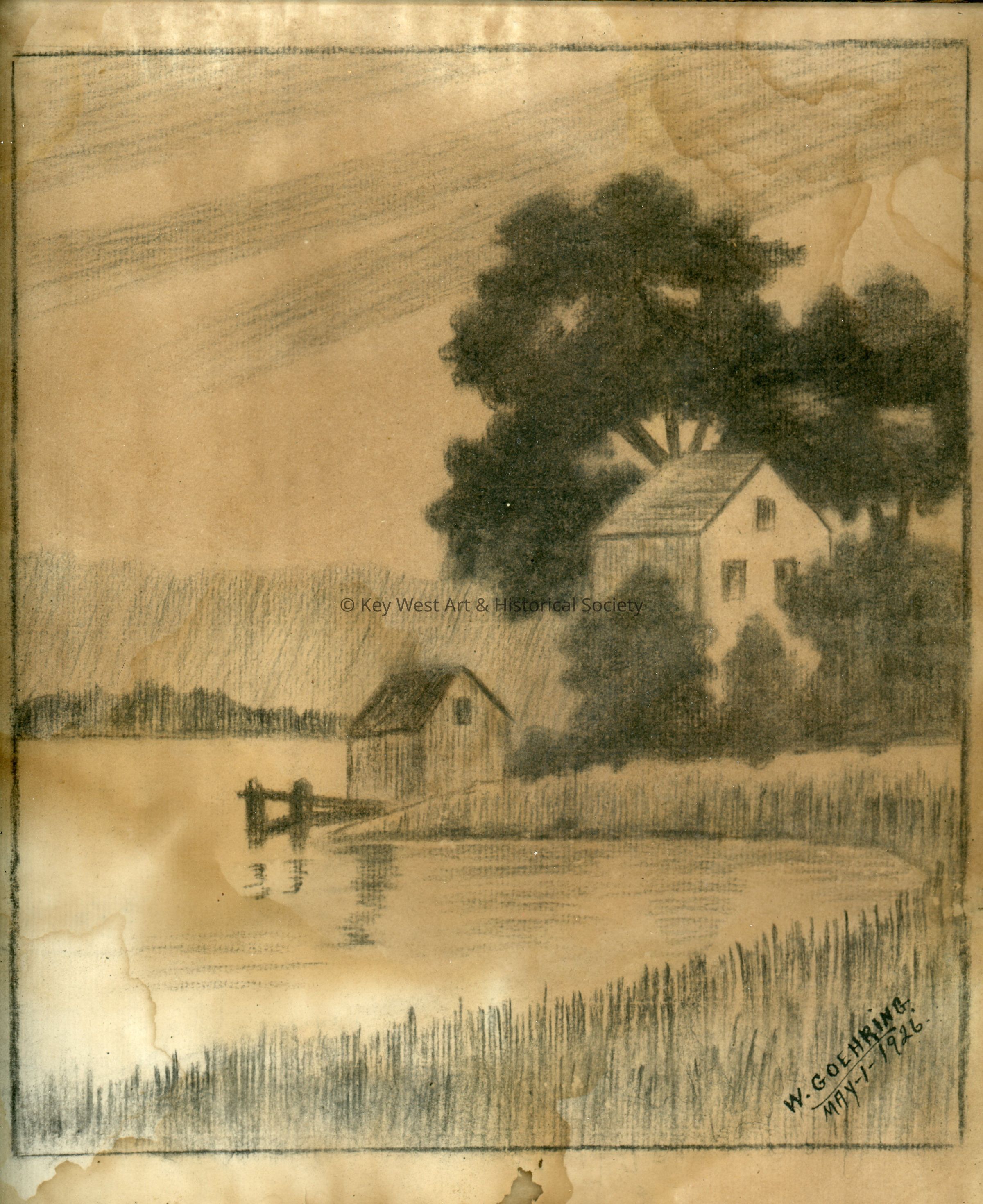 Framed pencil sketch on paper by Wilhelmina Goehring Harvey completed May 1, 1926. The drawing depicts a serene landscape featuring a house nestled among lush trees. In the foreground, there is a calm body of water reflecting the scene, bordered by a dock. Another smaller building, possibly a shed, sits at the water's edge.Type of Drawing