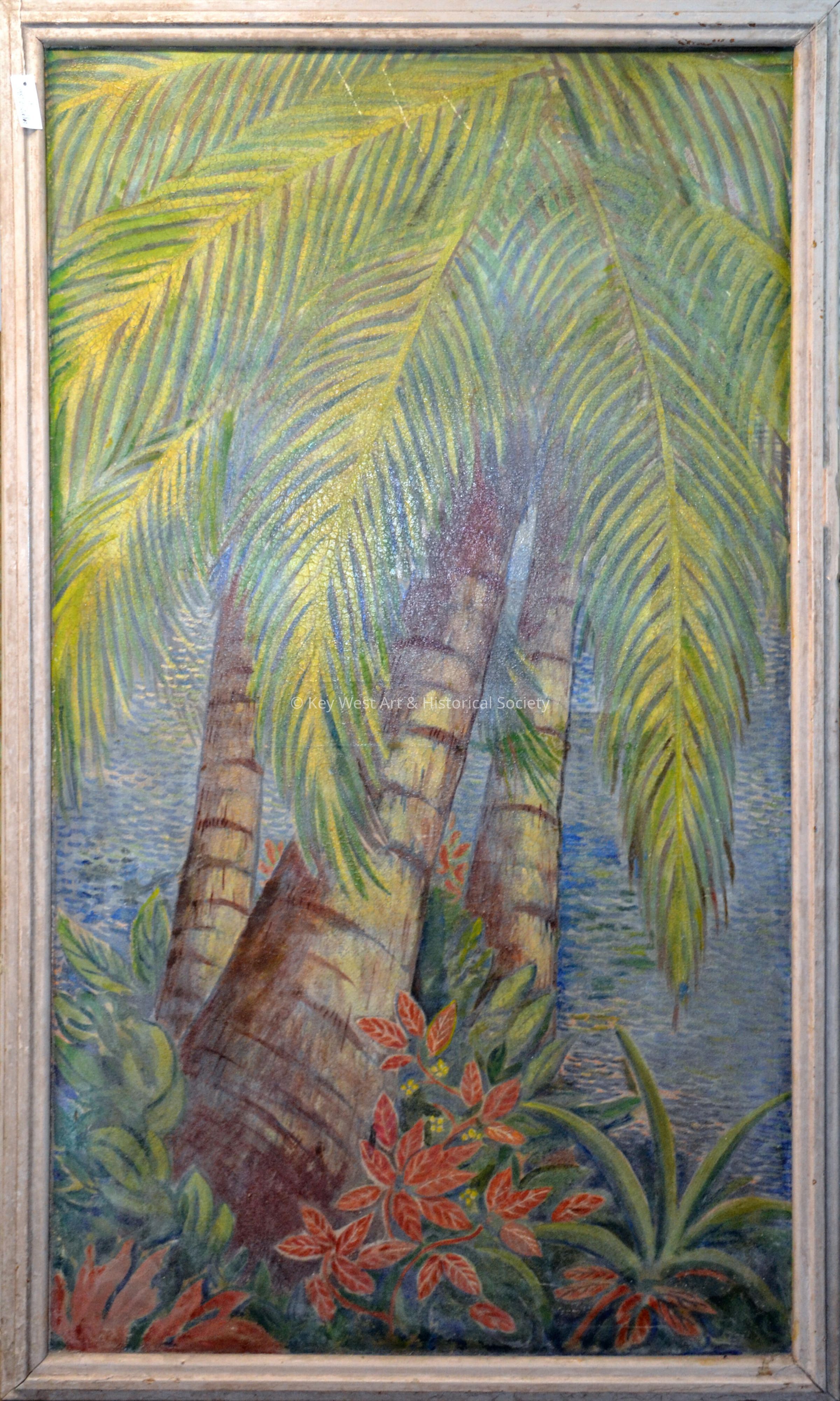 Oil on canvas triptych mural by Stanley Wood depicting an ocean view across to mangrove islands through tropical foliage.Collection