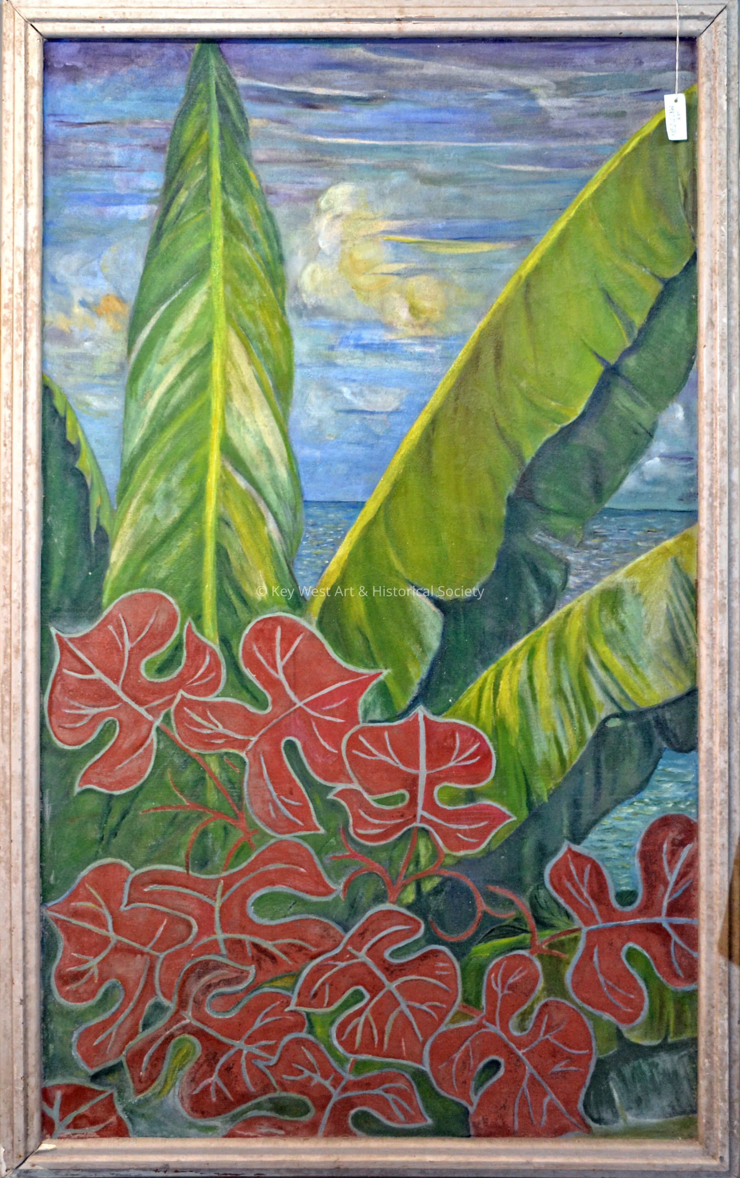 Oil on canvas triptych mural by Stanley Wood depicting an ocean view across to mangrove islands through tropical foliage.Collection