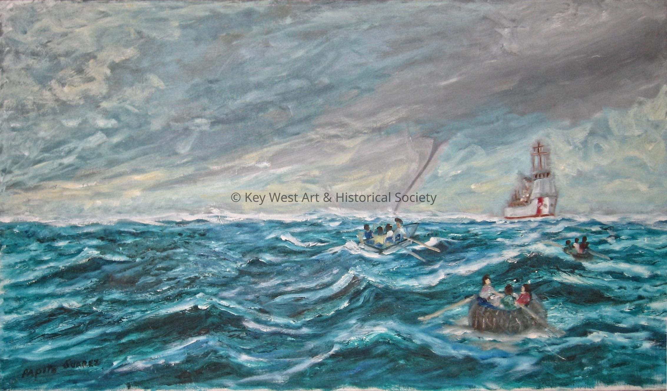 Oil on canvas by Papito Suarez depicting three small boats on the water along with a Coast Guard cutter. Presumably the three small boats are Cuban chugs carrying refugees across the Florida Straits. A water spout is visible in the distance.Type of Painting