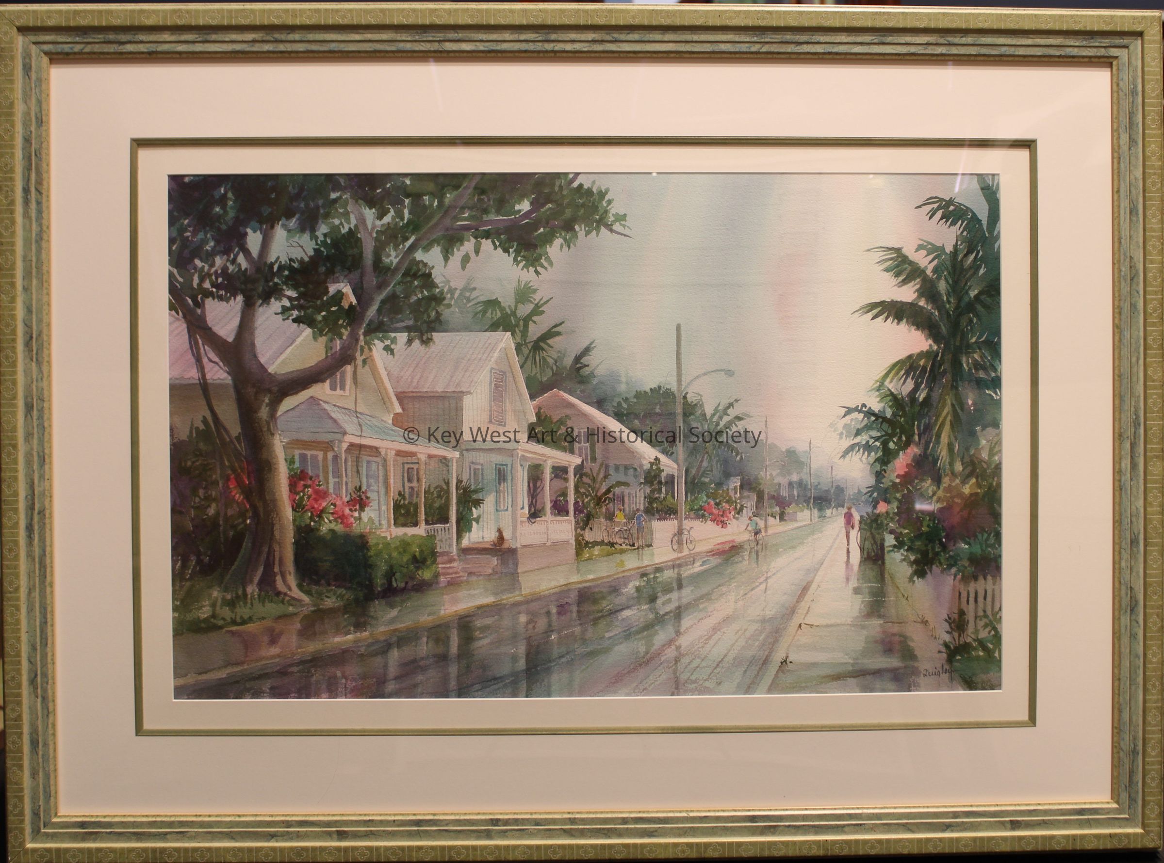 Untitled watercolor by Irma Quigley depicting a row of Key West conch houses following a rain shower.Artwork Details