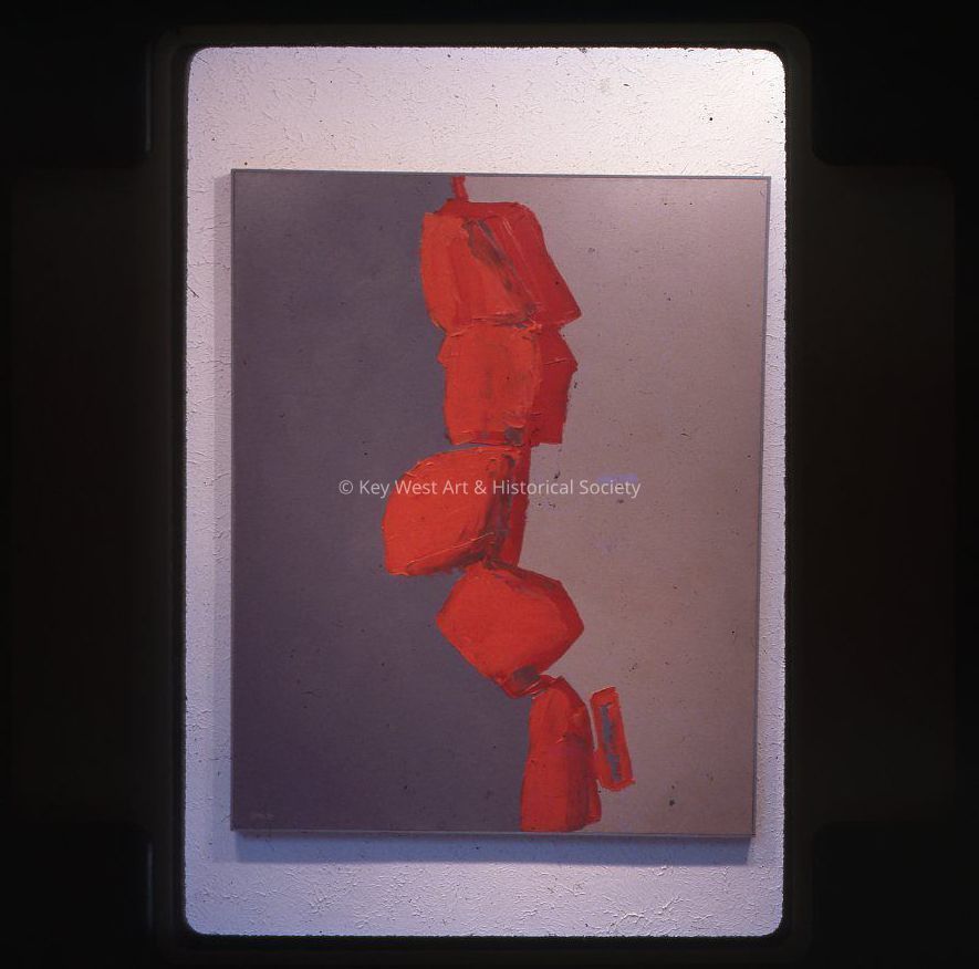 35mm color slide depicting an untitled oil on canvas painting by Ron Clemons. The work is abstract with red and gray hues. The original painting is 4' by 5'.