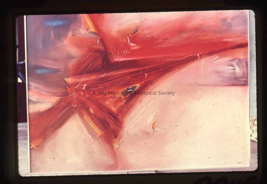 35mm color slide depicting an untitled oil on canvas painting by Ron Clemons. The work is abstract and is primarily composed of red hues. The original painting is 38" by 50".
