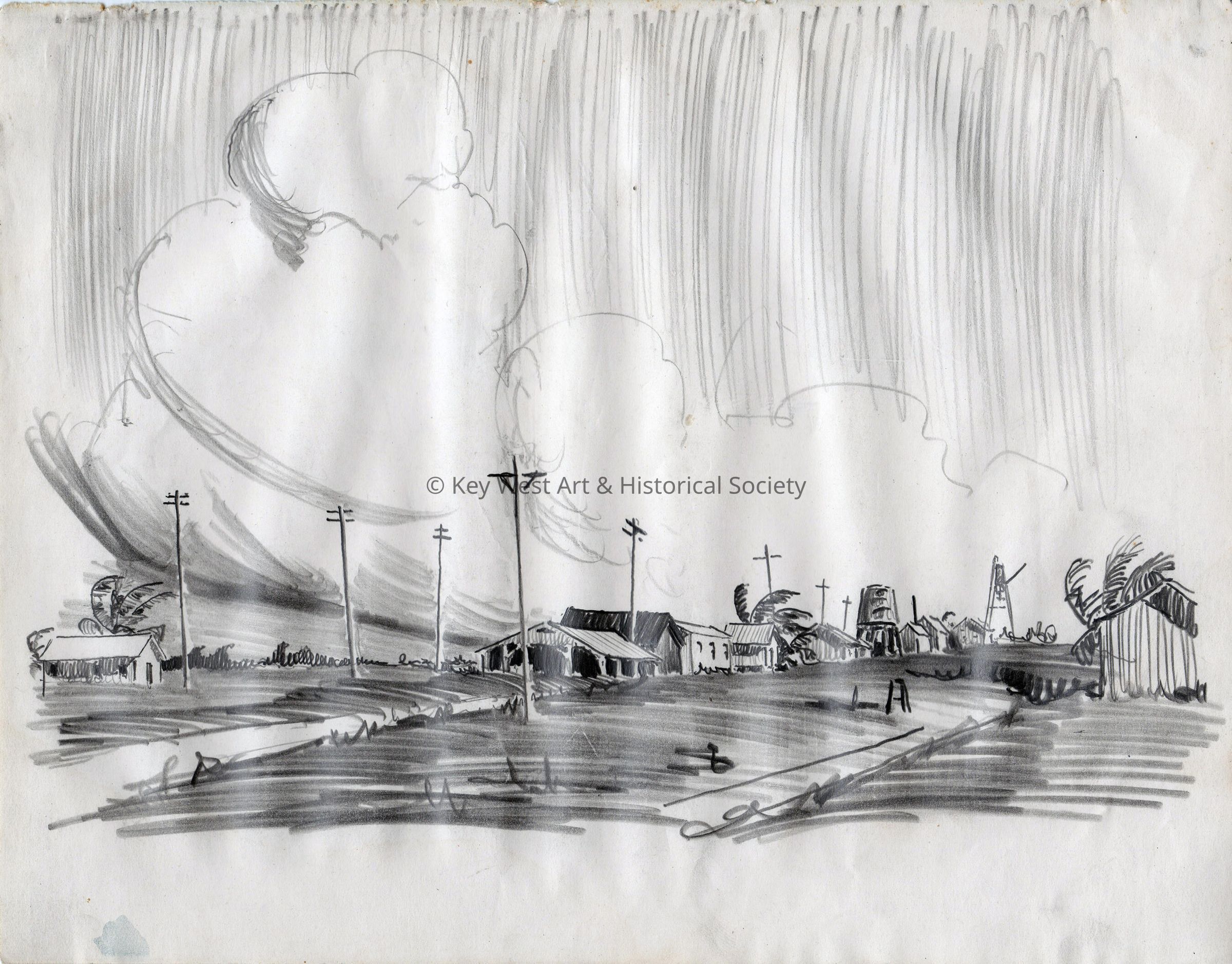 Graphite drawing by Walton Blodgett depicting an unknown street lined with electrical poles. A water tower is visible in the distance and storm clouds are rolling in.Type of Drawing