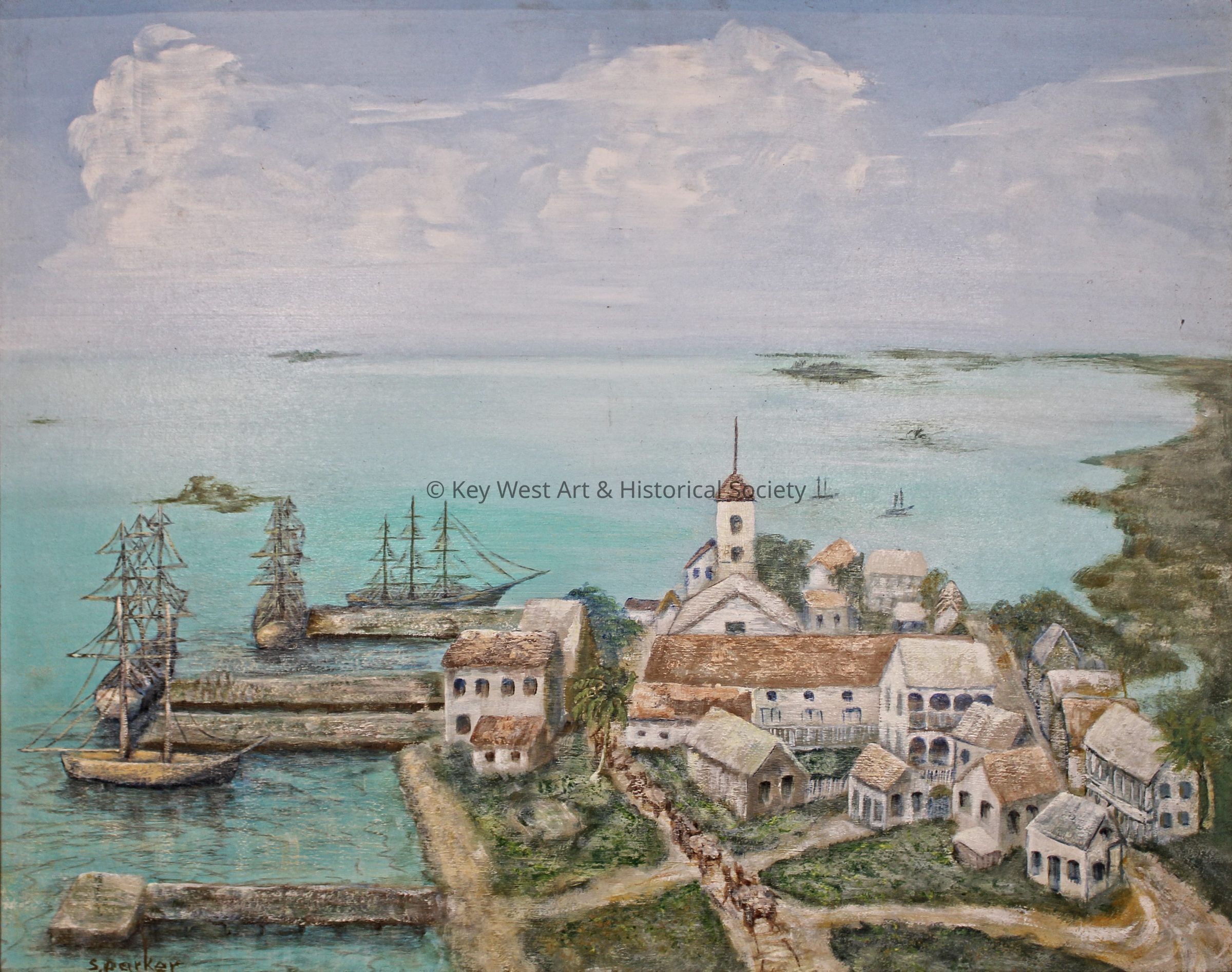 Oil on canvasboard by Sara Parker depicting Key West's seaport during the 1830s. Taken from a William Whitehead sketch completed in 1838. In the foreground, several tall ships are moored at a wooden dock, reflecting the maritime lifestyle of the island. A clear day with cloudy skies stretches over a tranquil sea, with small boats visible in the distance, suggesting ongoing activity and trade.Type of Painting