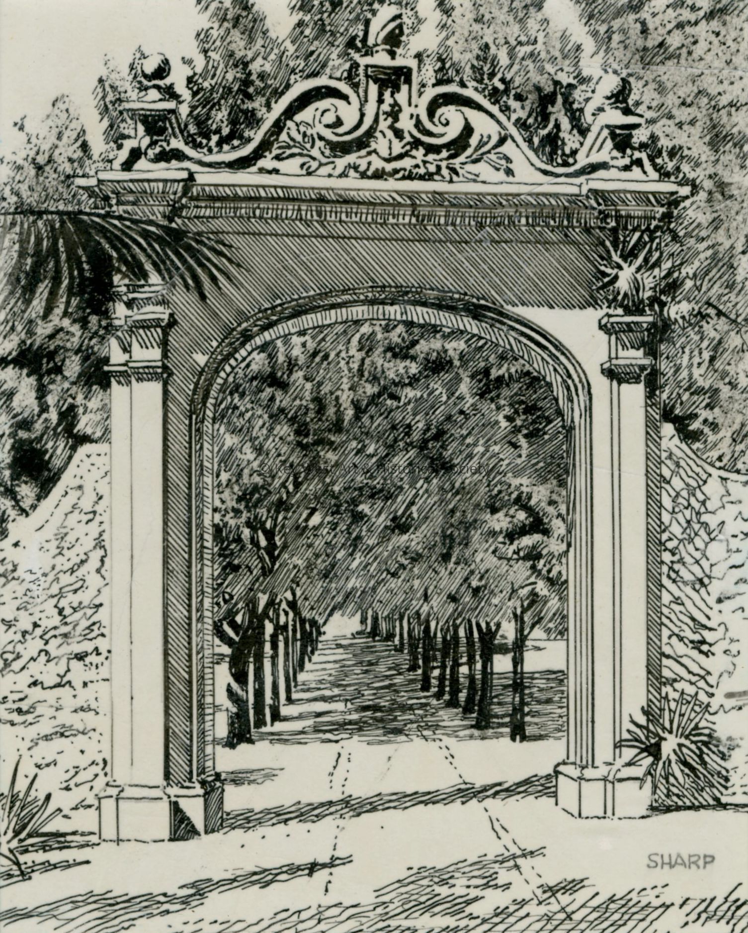 Pen and ink drawing on paper by Stan Sharp depicting an ornate gate into possibly a private estate or public park. The archway itself is adorned with elaborate ornamentation, including a detailed, decorative crest at the center top, which features swirls and botanical motifs flanked by sculptures or planters on its wider ledge. The columns supporting the arch are classical in design, contributing to the image's overall feeling of a formal, manicured garden or park setting. This serene avenue invites one to stroll or perhaps pause to appreciate the interplay of light and shadow, and the pattern created by the trees as they recede into the distance.Type of Drawing