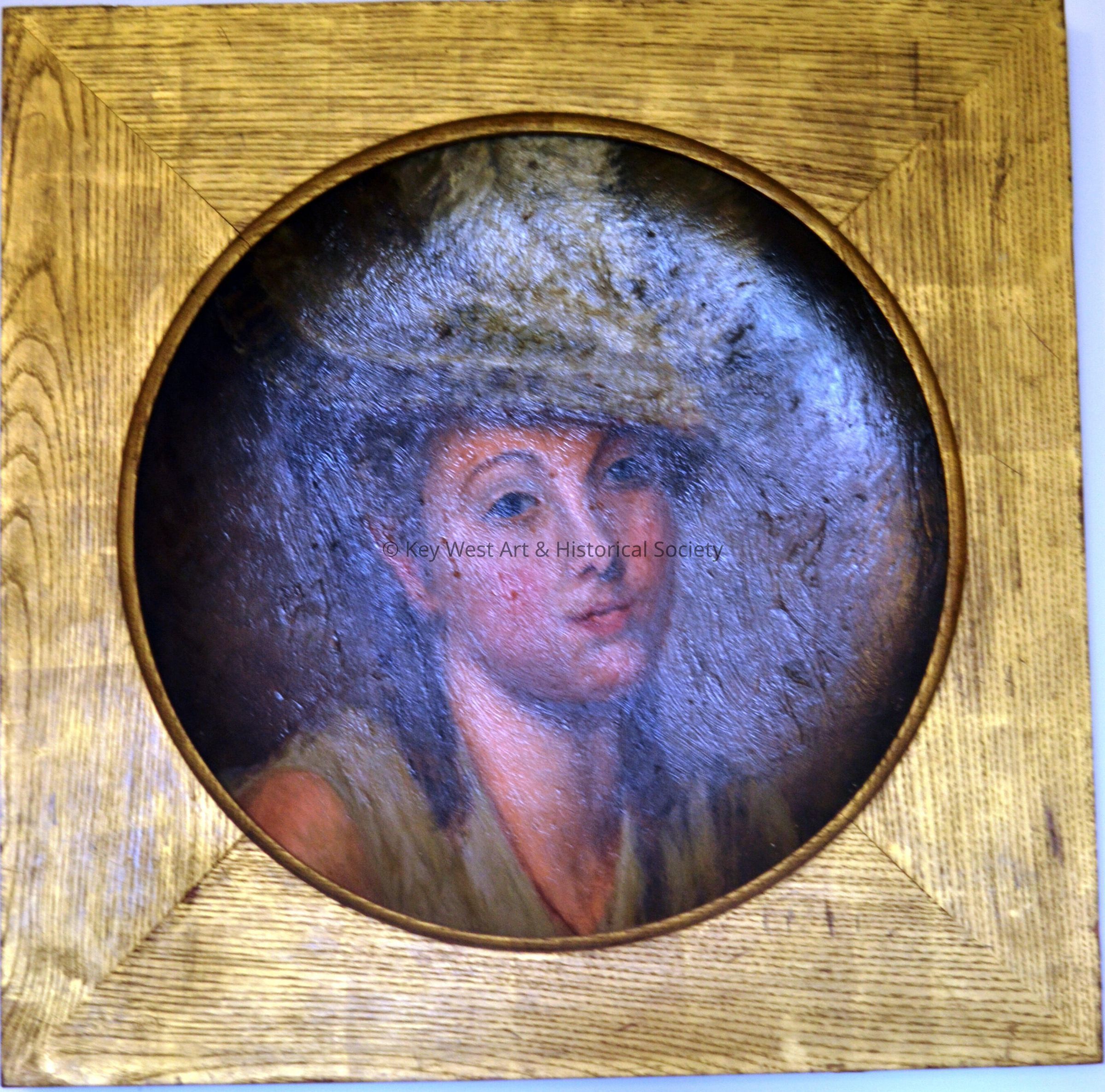 Oil painting on wood. Wood is concave. Image of a woman wearing a big feather hat.Type of Painting