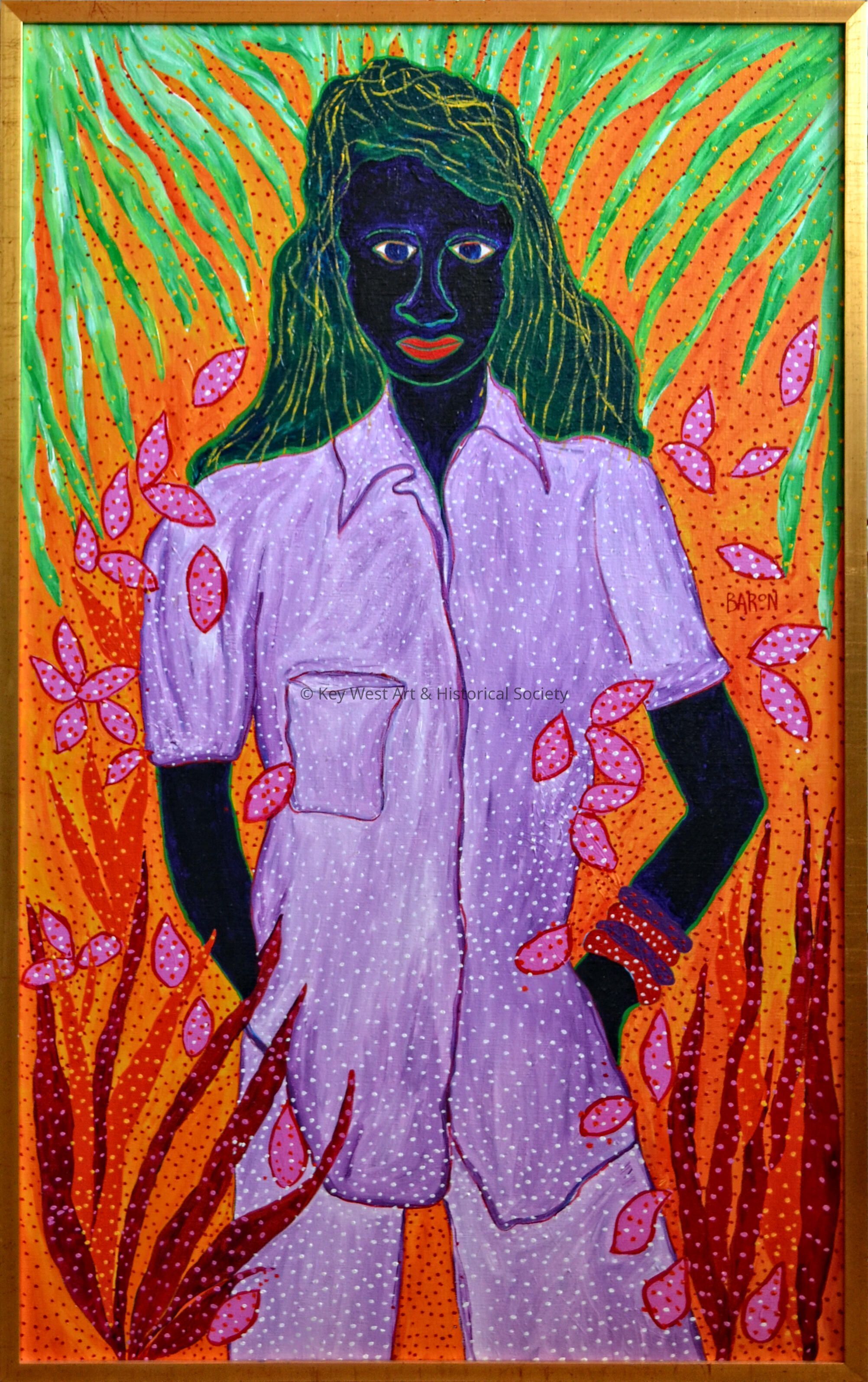 Acrylic painting by Jack Baron depicting a black woman wearing a purple shirt and purple pants. She is flanked by palm fronds.Type of Painting