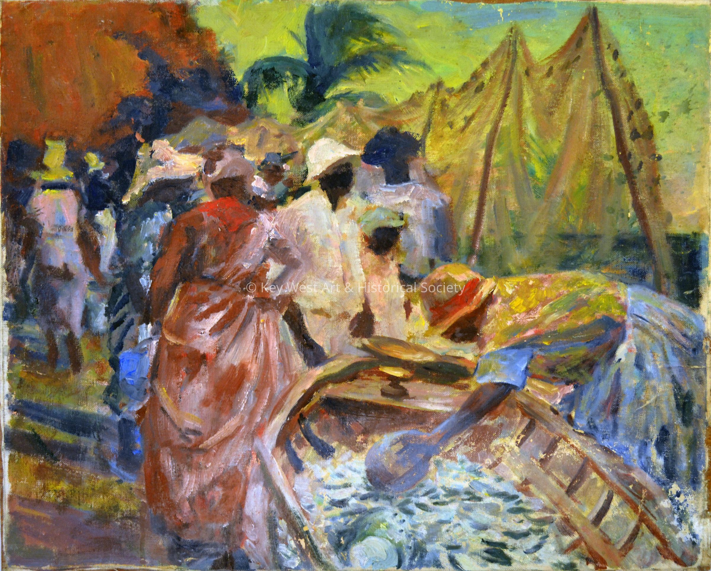 Oil painting on canvas by Gerald Leake depicting a vibrant scene beside a river where a group of people, clad in various hues of loosely draped garments, gathers under lush greenery. On the right, an individual in a rowboat, adorned in a vividly colored outfit and a hat, leans forward. The background reveals a bright, sunny atmosphere, fostering a lively ambiance that blends harmoniously with the animated gathering, possibly a dockside fish market.Type of Painting