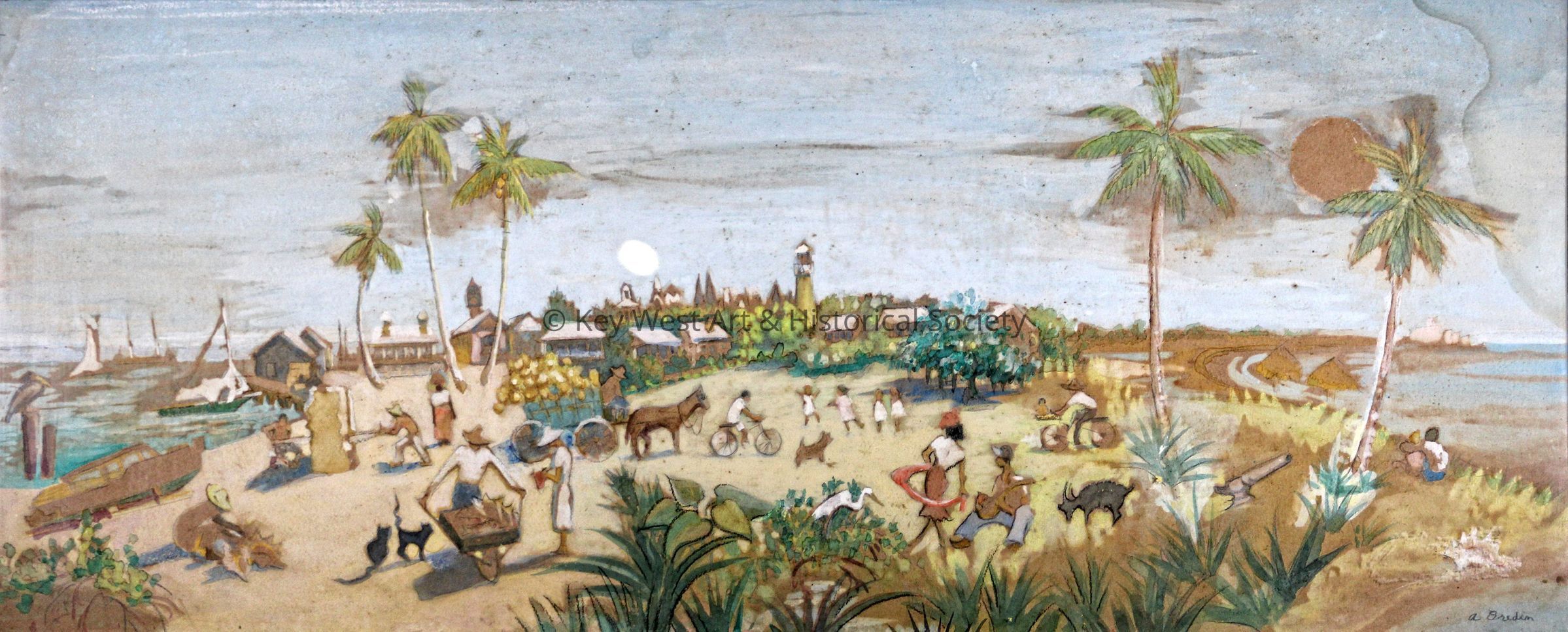 Watercolor on paper by Alice Bredin depicting an early view of Key West with several figures near the shoreline partaking in many of the island's industries including shipbuilding, fishing, and sponging. Conch houses in the background as is the Key West Lighthouse.Artwork Details