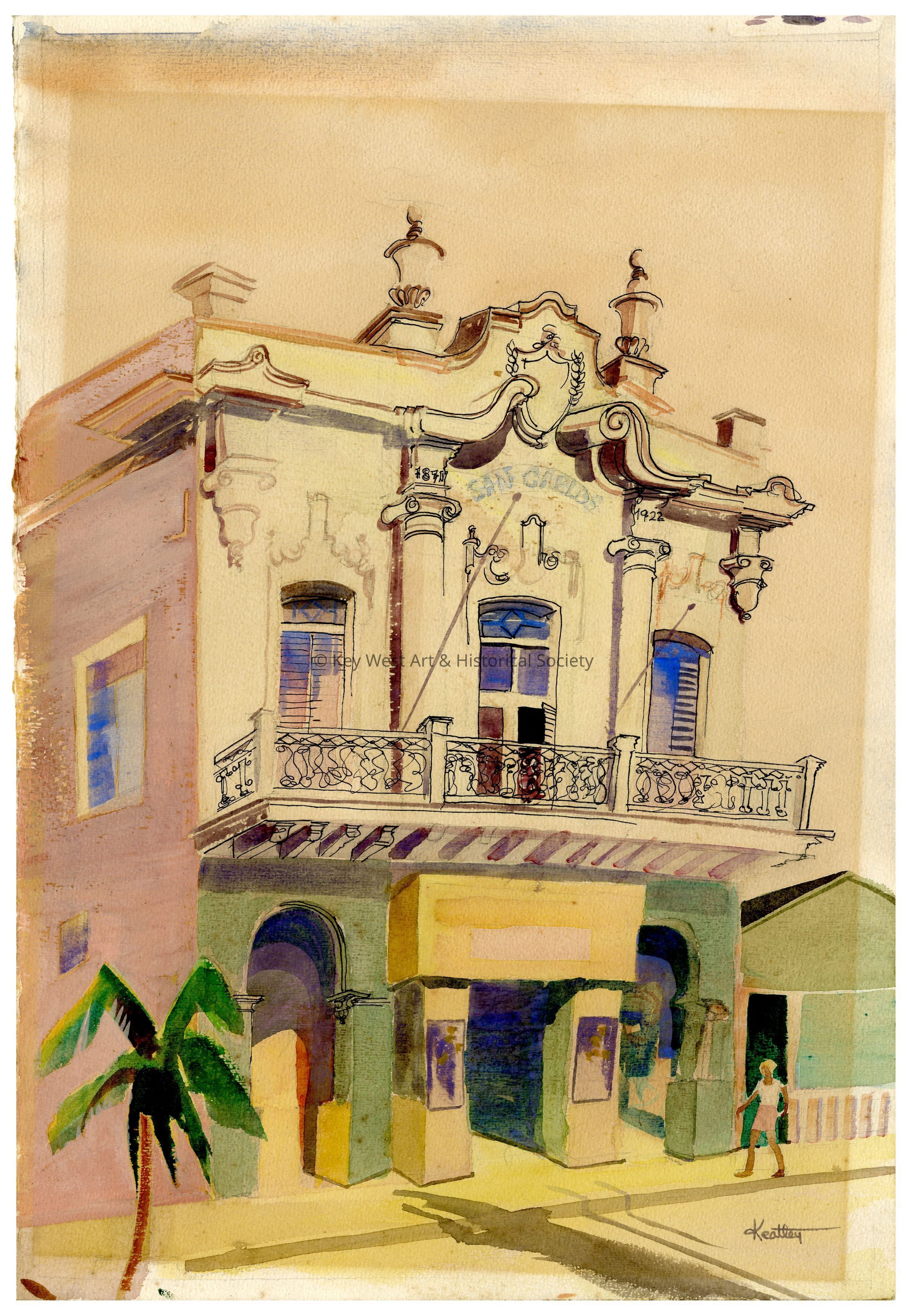 Watercolor painting by Keatley depicting the San Carlos Institute at 516 Duval Street. The two-story structure features a lavish facade with a curvaceous baroque gable adorned with intricate decorations. The first level has arched entrance ways and a shaded sidewalk, while the second level boasts balconies framed by ornate railings and windows with blue shutters. On the left side of the scene, a large palm tree is situated, and a lone figure walks by, contributing to the quaint, serene atmosphere captured in this vibrant artwork.Artwork Details