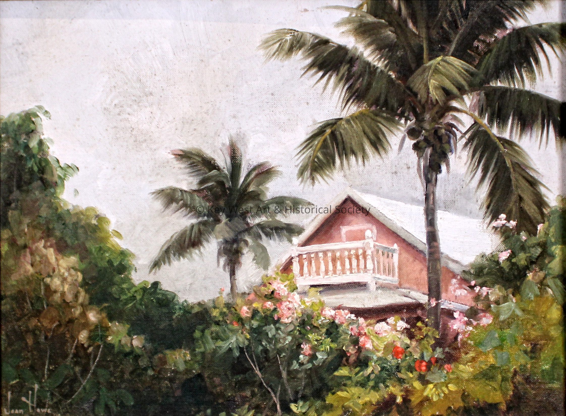 Oil on canvas painting by Joan Howe depicting a serene tropical scene, showcasing a charming, traditional pink conch house nestled amid lush greenery and vibrant flowers. The house, which features a metal roof and a cozy second floor porch, is partially obscured by the flourishing plants and palms, suggesting a hidden oasis. The soft brushstrokes and natural color palette give the artwork a calm and inviting feel, inviting the viewer into this peaceful retreat.Type of Painting