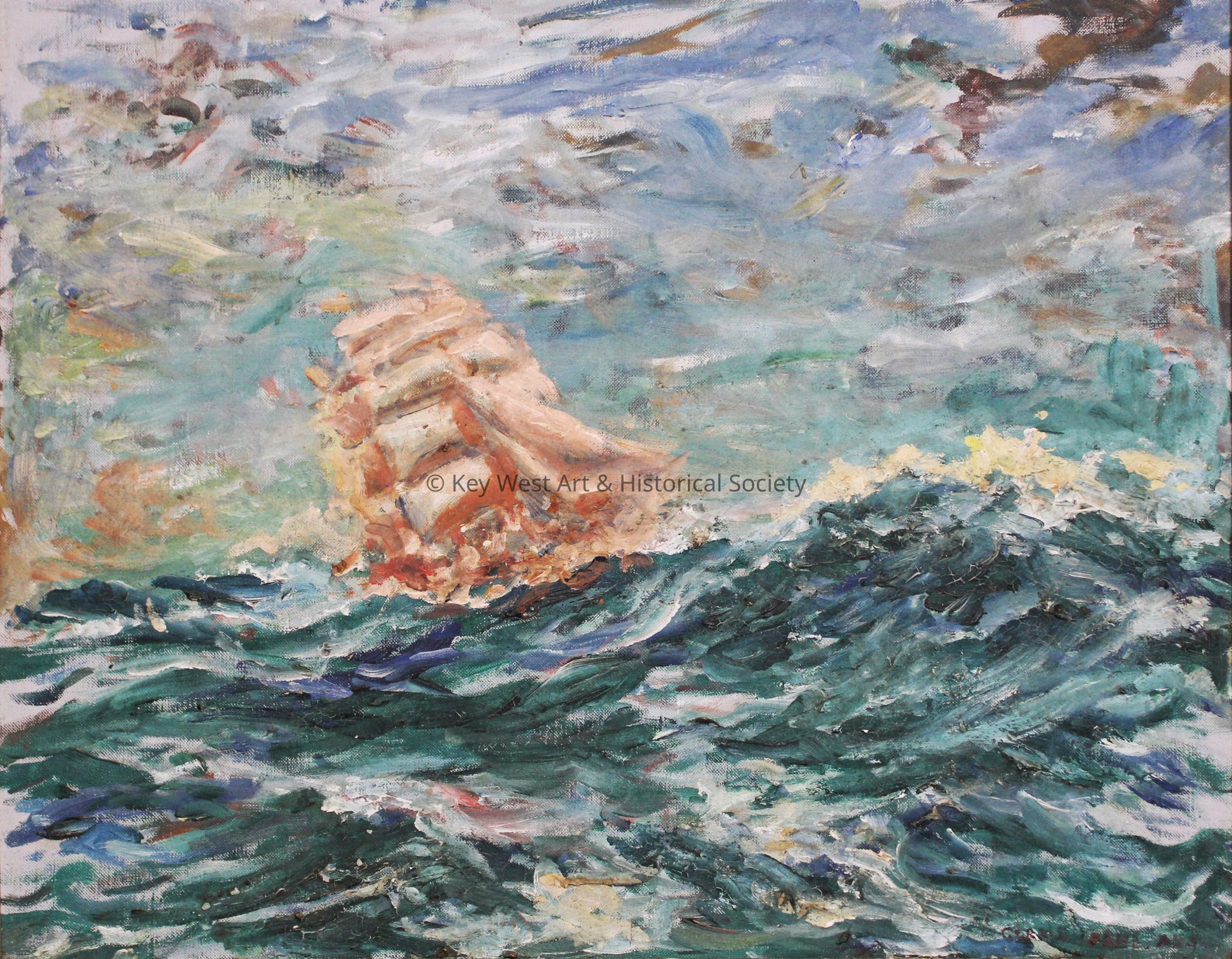 Oil painting on canvas by Gerald Leake depicting a square rigged ship sailing on rough seas. Leake uses a dynamic palette of blues, greens, whites, and splashes of yellow and red, conveying the ferocity of a storm at sea. The strokes are loose and expressive, adding a sense of movement and raw emotion to the scene. The sky, a whirl of lighter tones and chaotic brushwork, adds to the sense of an ongoing struggle against natural forces.Type of Painting