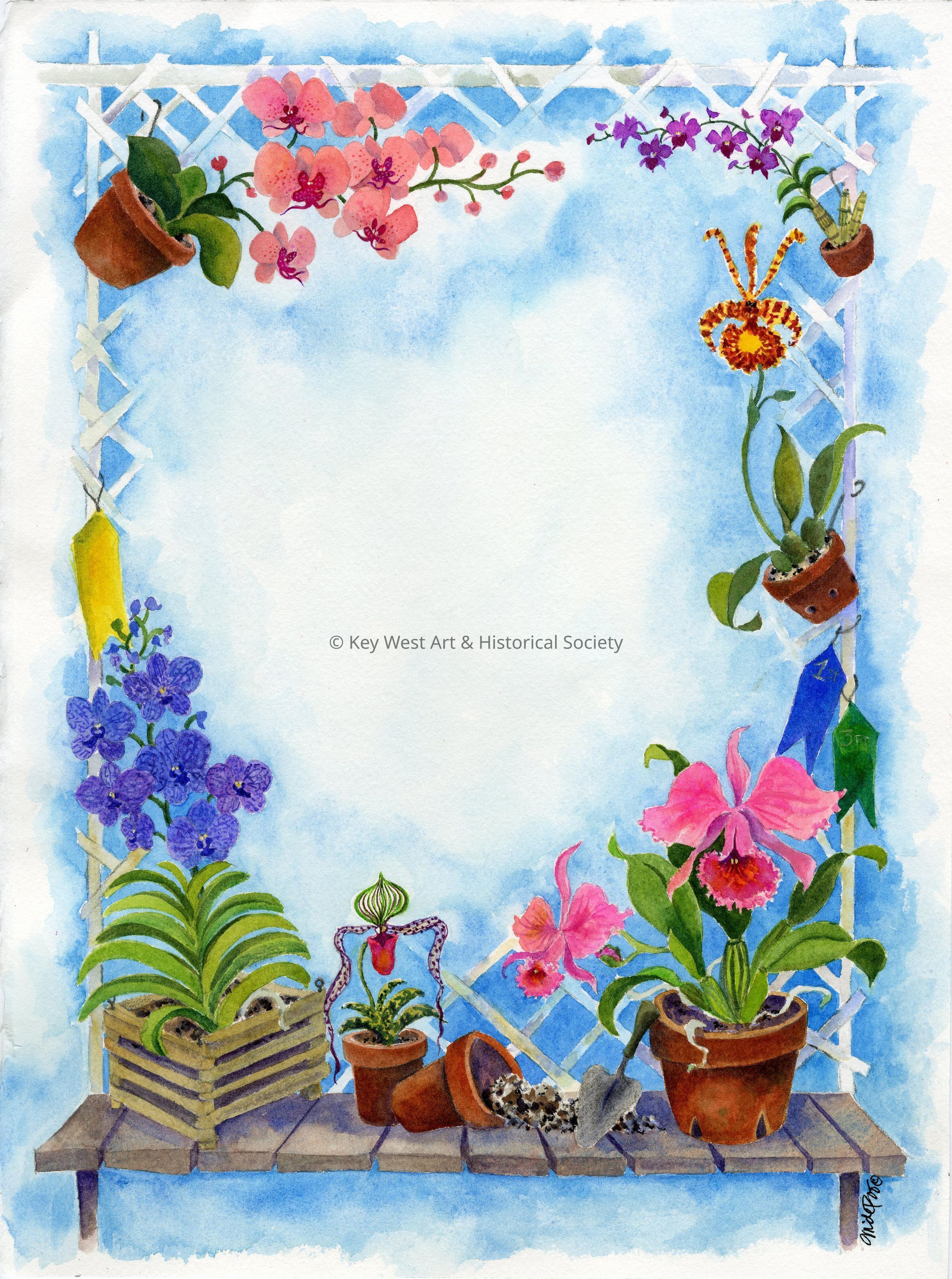 Watercolor painting by Martha dePoo depicting a trellis with several orchid plants hanging from it . It was created for the Key West Orchid Society for use in promotions.Collection
