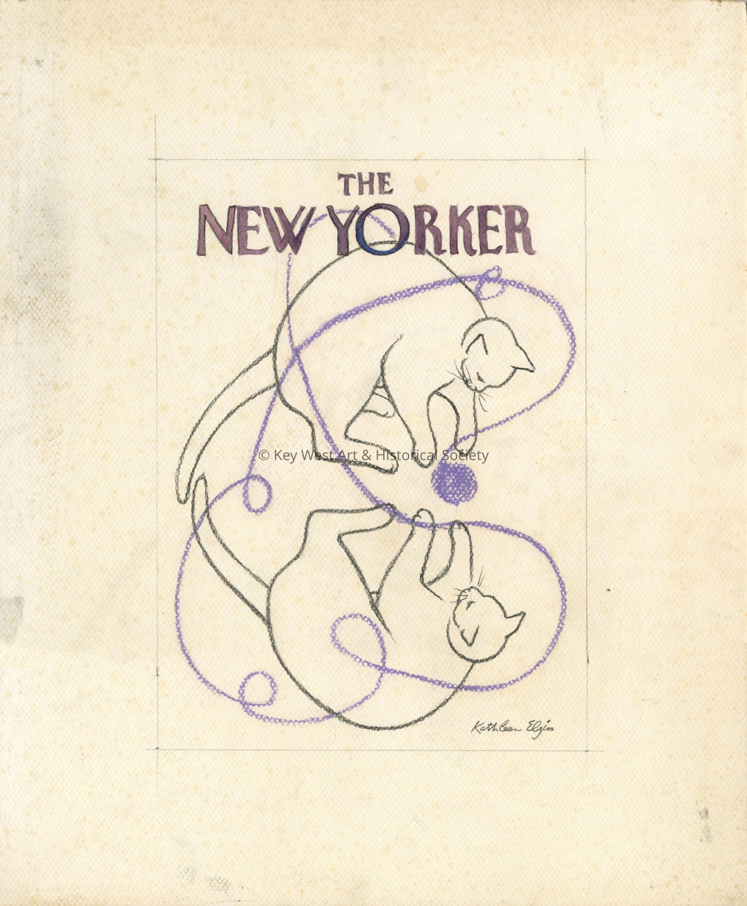 Watercolor, charcoal and colored pencil illustration of 'The New Yorker' cover by Kathleen Elgin depicting two kittens playing with a ball of yarn.Artwork Details