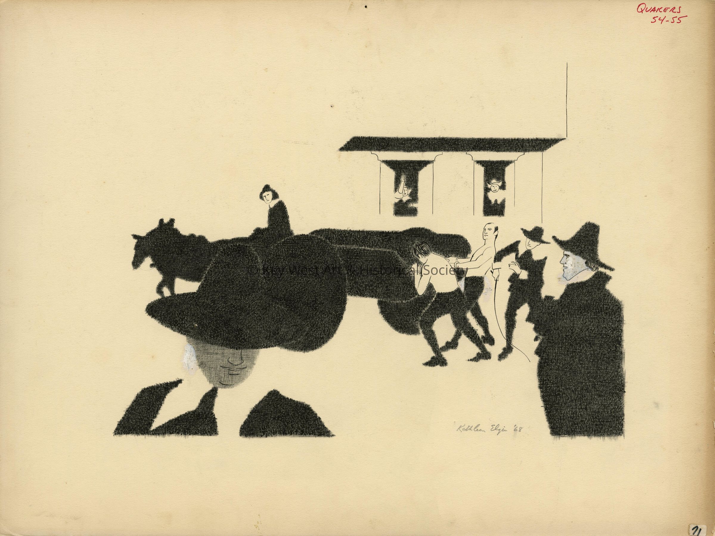 Pencil and ink illustration by Kathleen Elgin depicting a group of men belonging to the Quaker religious society. The illustration was likely used in a religious publication.Collection