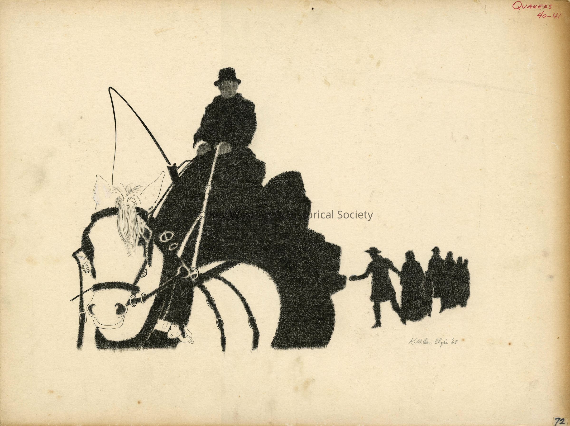 Pencil and ink illustration by Kathleen Elgin depicting a group of men belonging to the Quaker religious society. The illustration was likely used in a religious publication.Collection