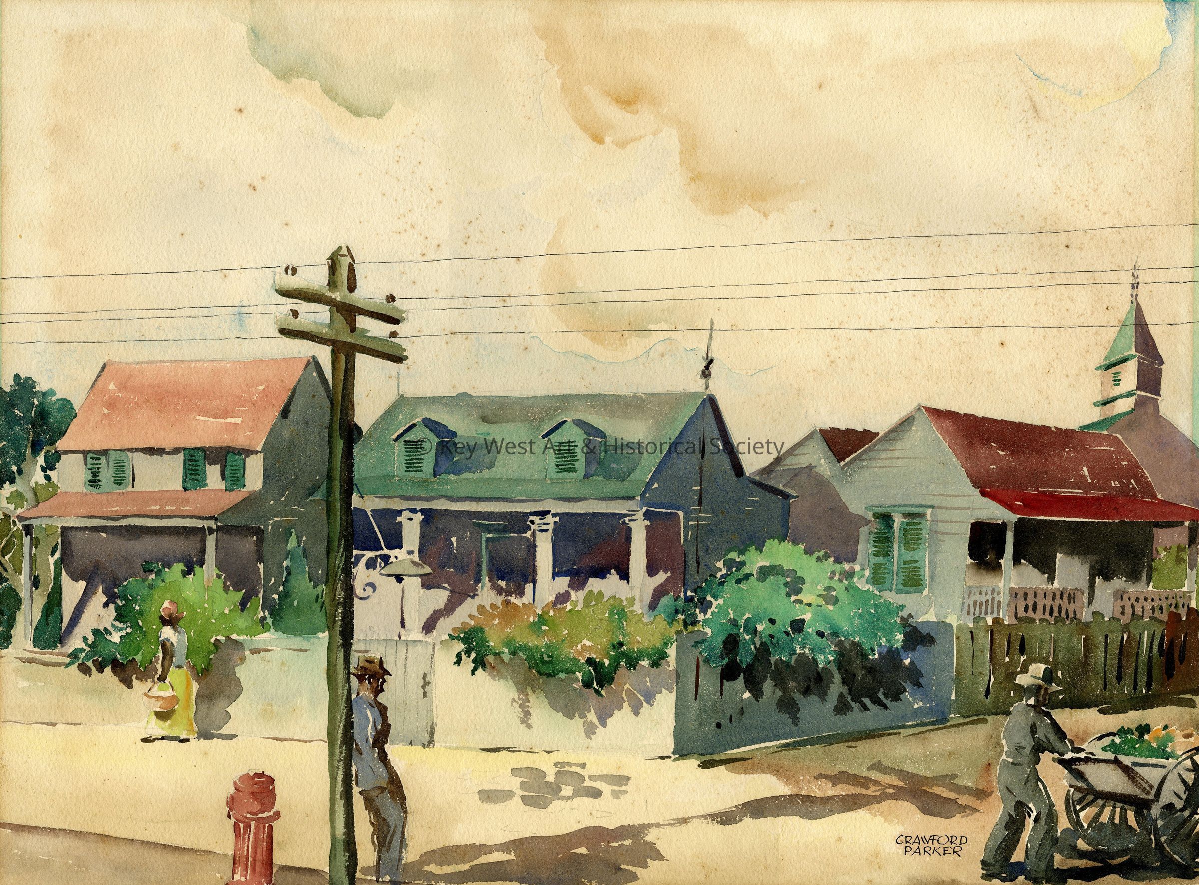 Watercolor on paper by Crawford Parker depicting a street corner, possibly Key West. A man leans against the power pole while another pushes a cart full of fruits and vegetables. A woman walks down the sidewalk in the opposite direction.Collection