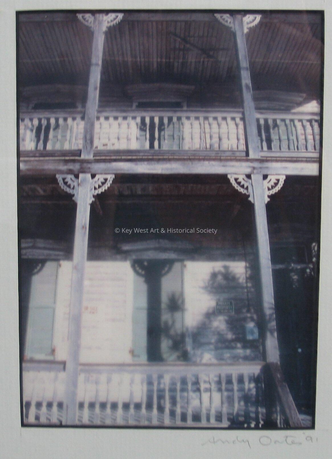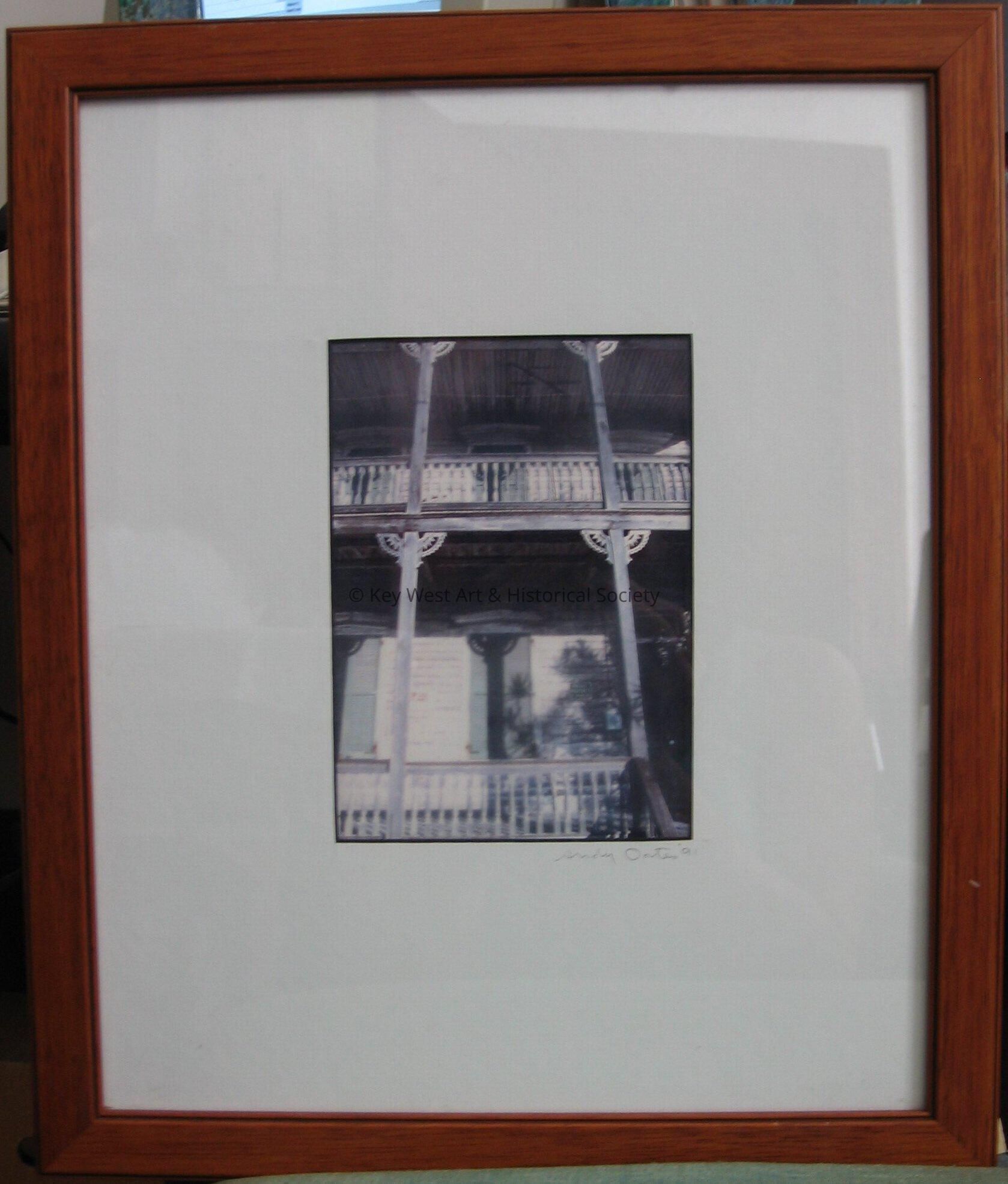 Color photo framed and matted. Image of a two story porch with shuttered windows.