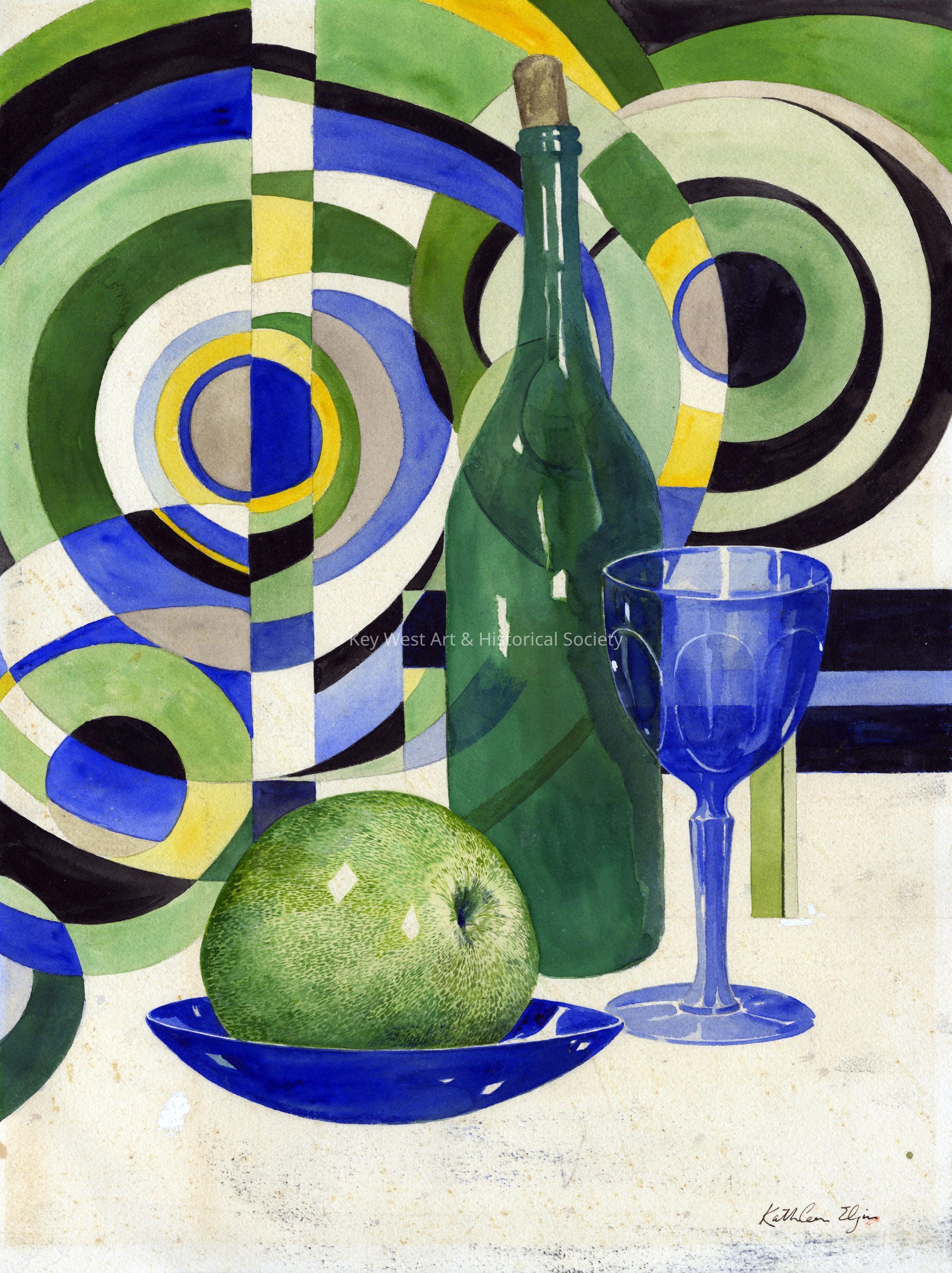 Watercolor, pen and ink abstract still life by Kathleen Elgin depicting a wine bottle and glass alongside an apple. There is a geometric pattern in the background.Artwork Details