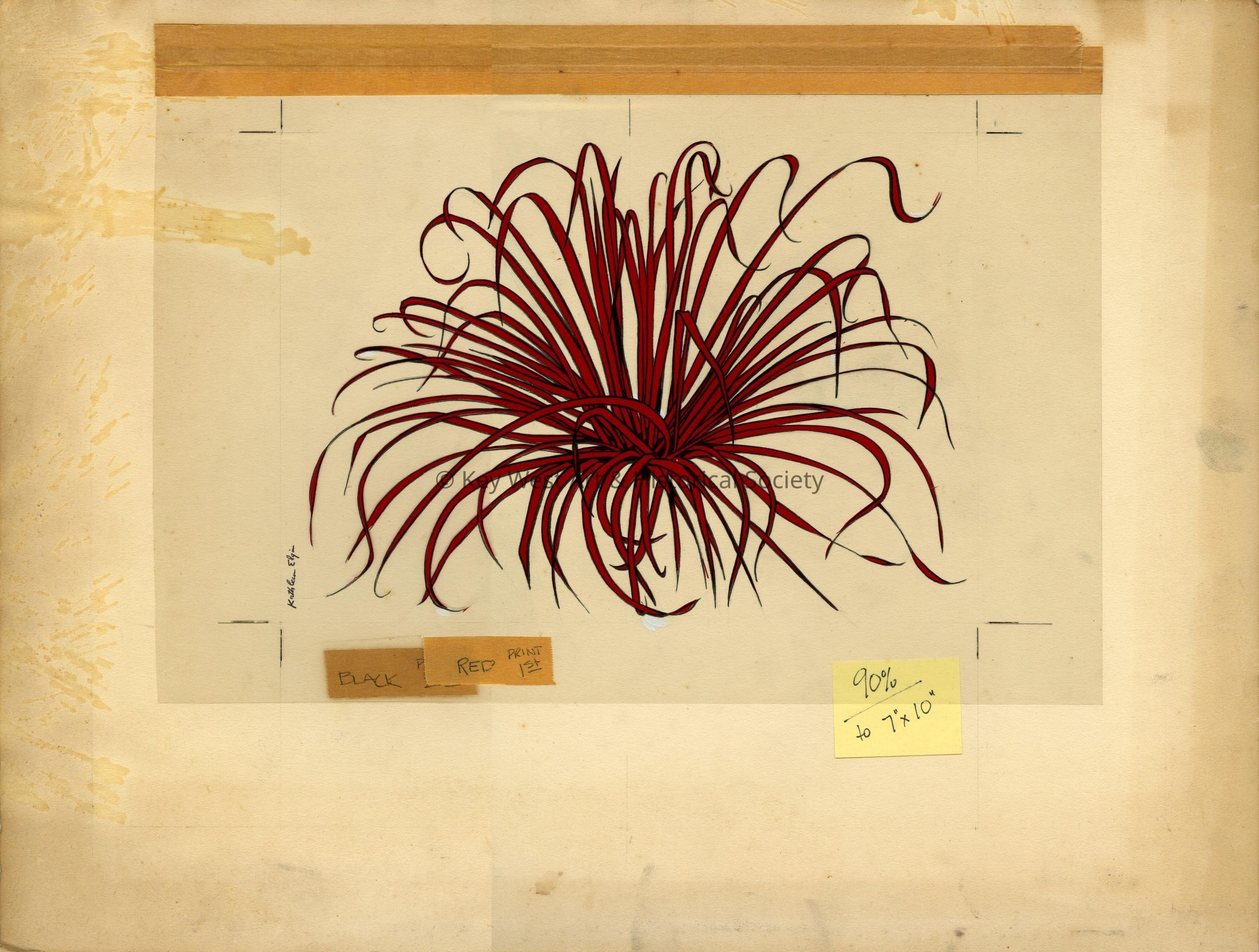 Ink illustration by Kathleen Elgin depicting an unidentified grassy plant. Two pieces used for printing in color. This piece is the black ink layer that is used with the color separation transparency.Collection