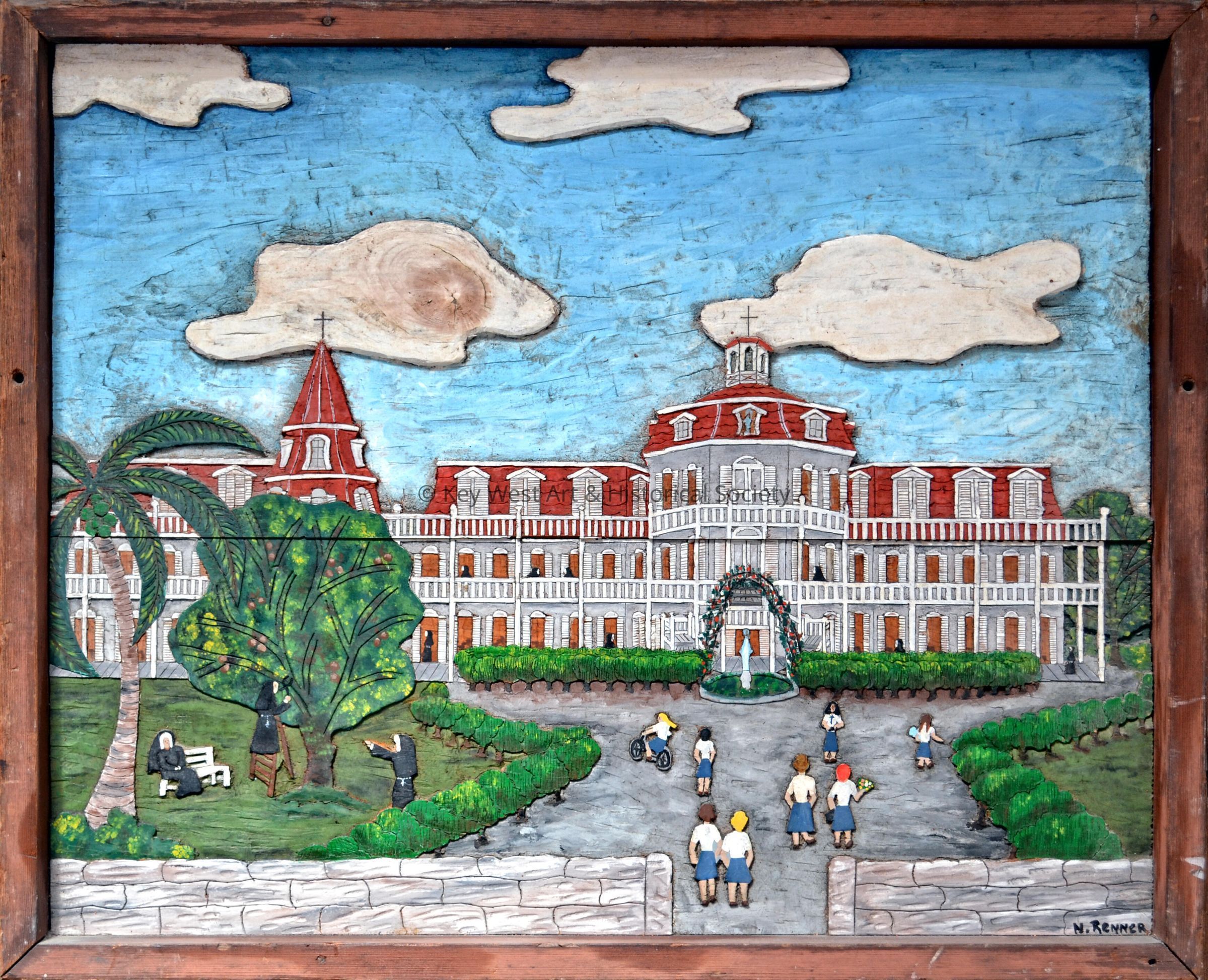 Painted wood carving by Norma Renner depicting the Convent of Mary Immaculate building with school children playing and nuns on the grounds.