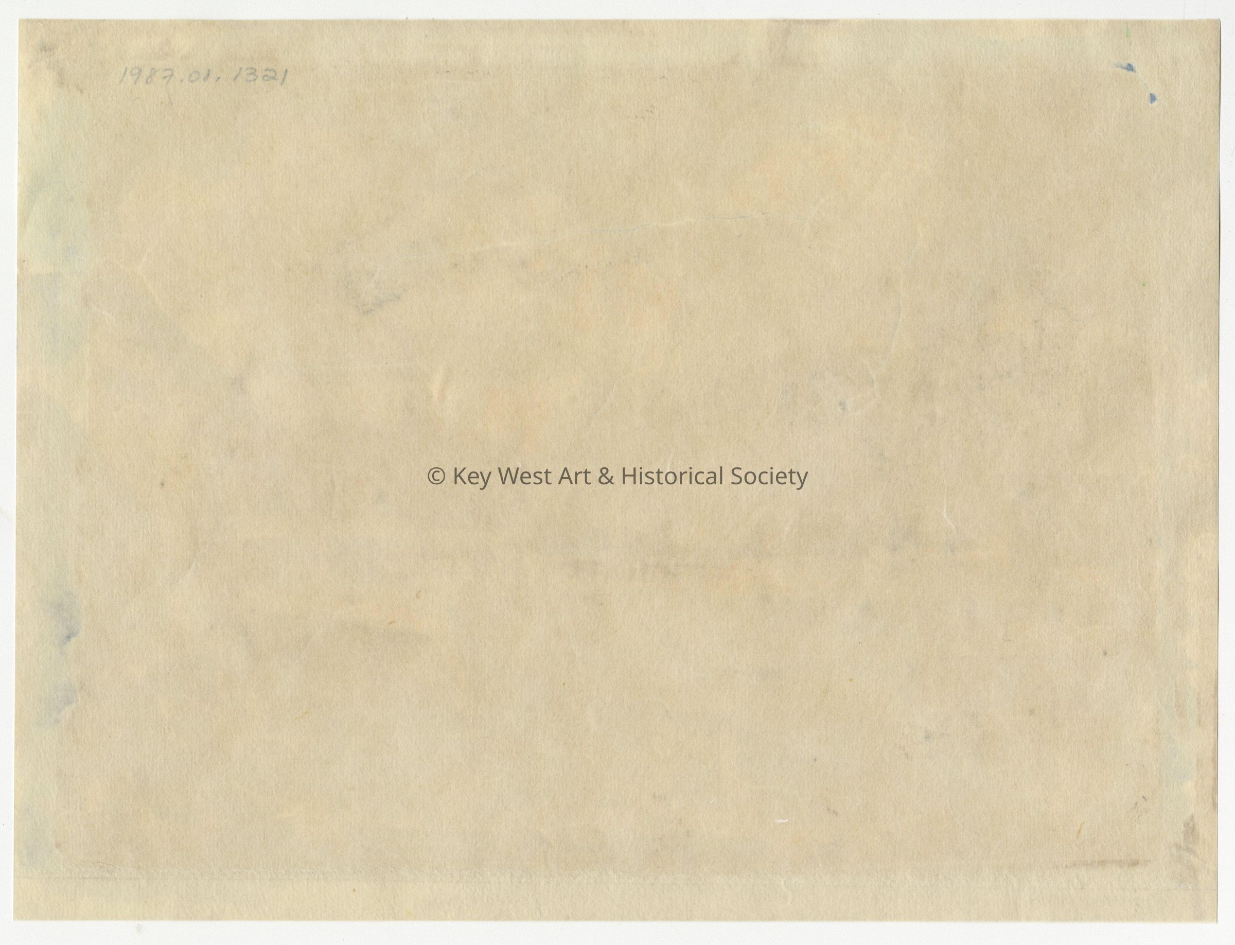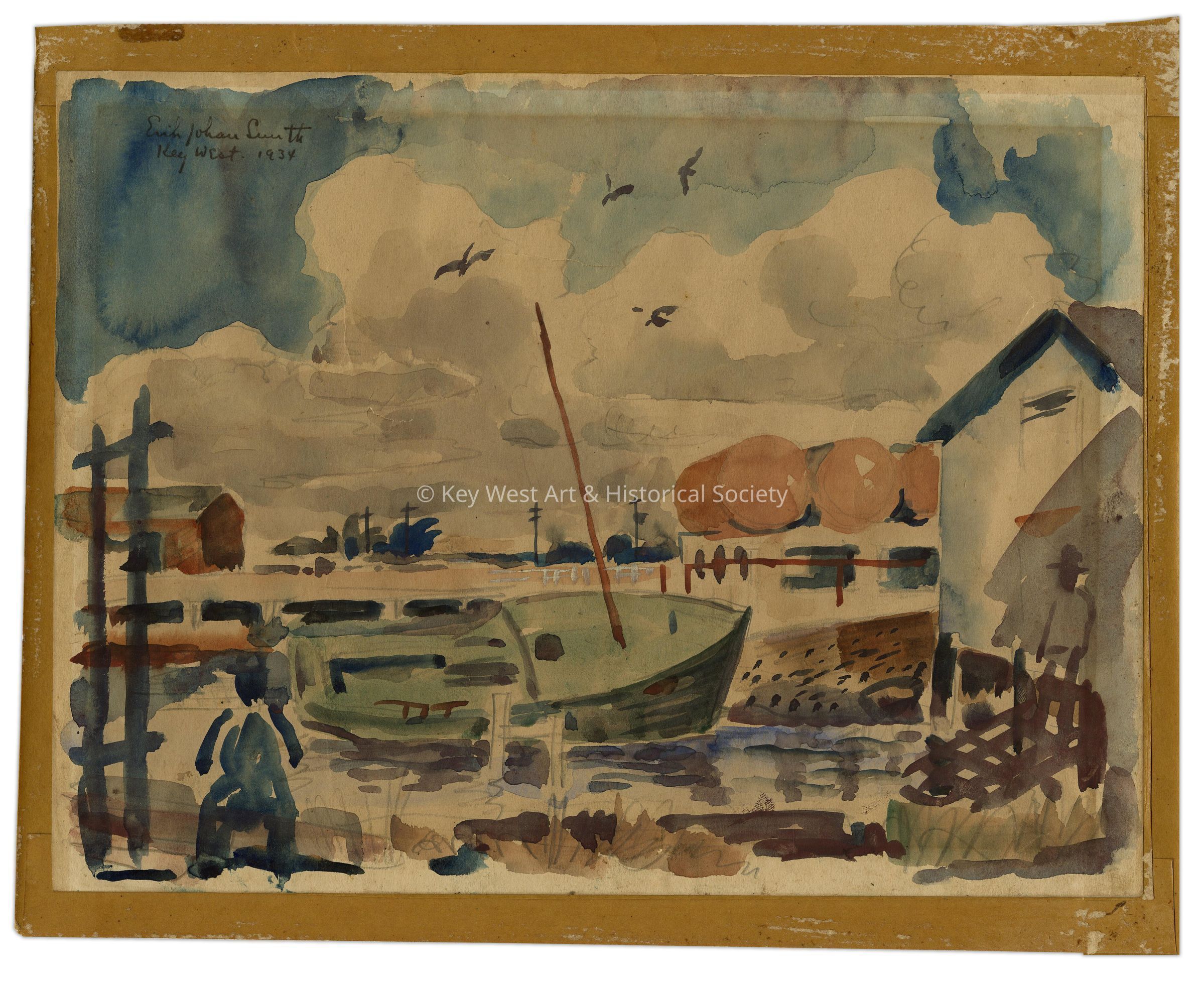 Watercolor by Erik Johan Smith depicting a green sailboat careened in the Key West Bight. Waterfront workers and buildings in the foreground. Watercolor produced as part of the WPA project in Key West during the Great Depression.Artwork Details
