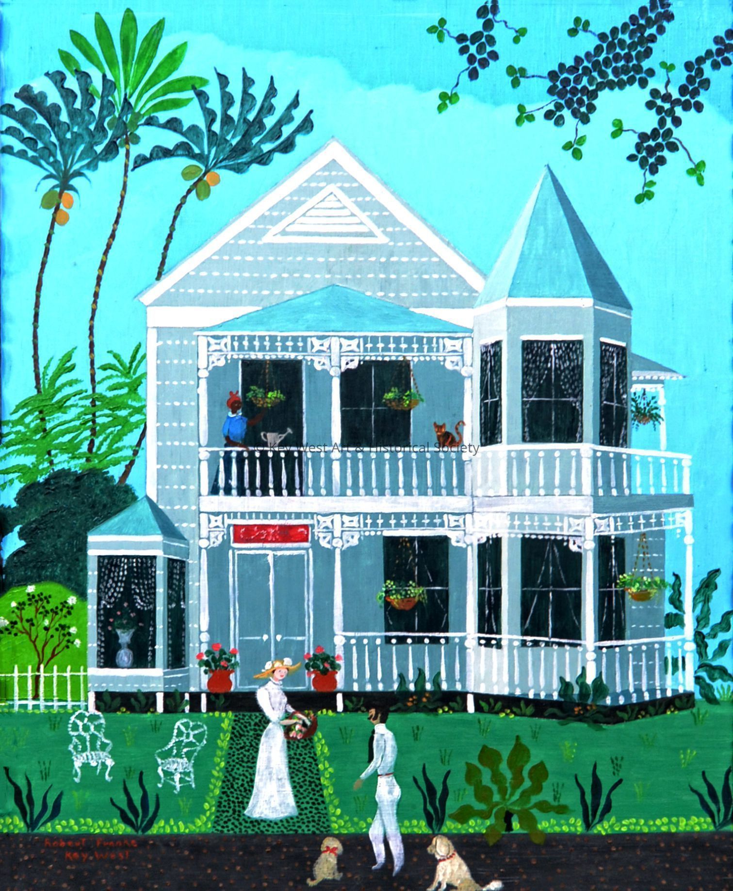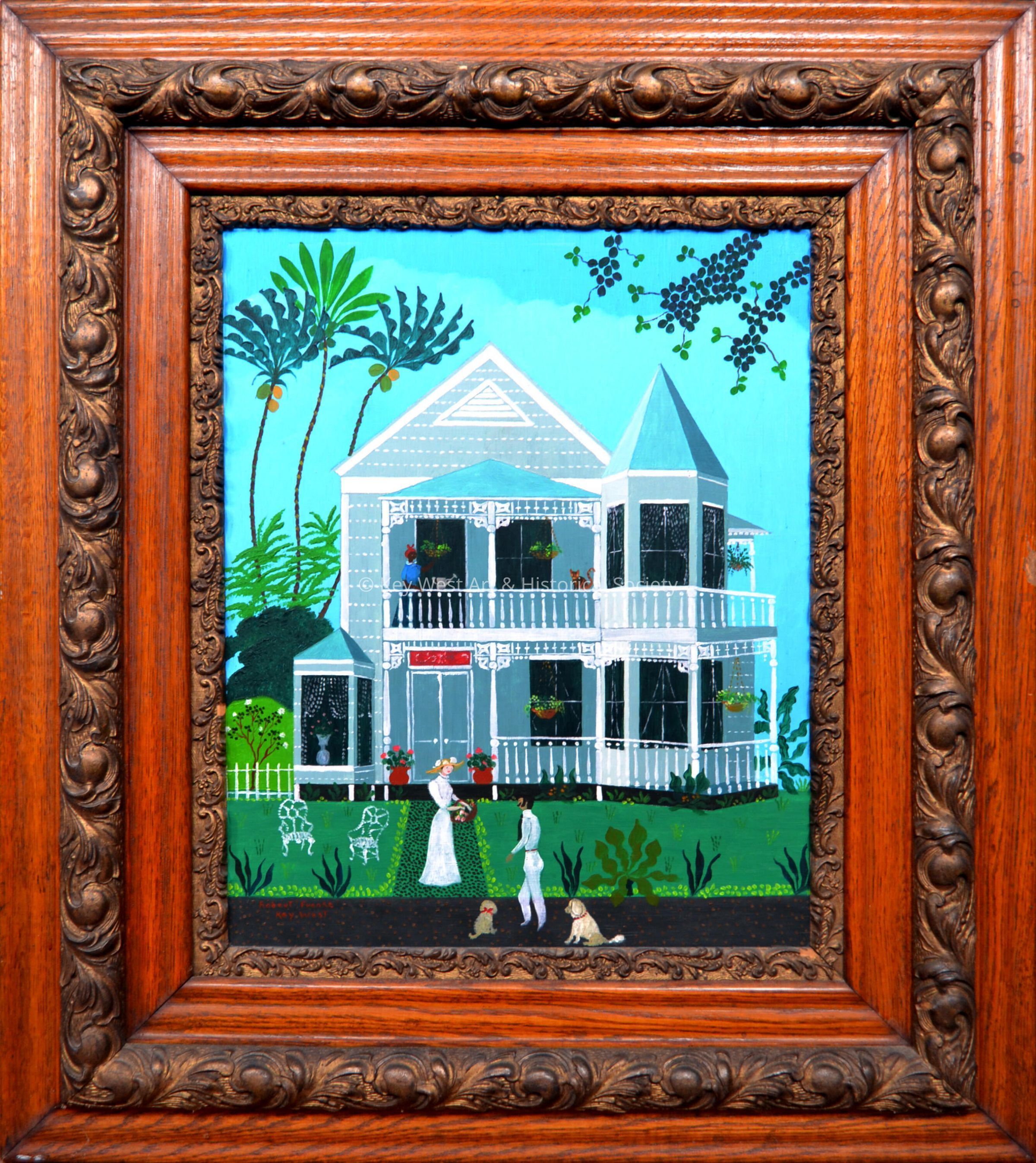 Oil painting on masonite by Robert Franke depicting an early twentieth century Key West house with turret. A man, woman and two dogs stand outside of the house.Artwork Details