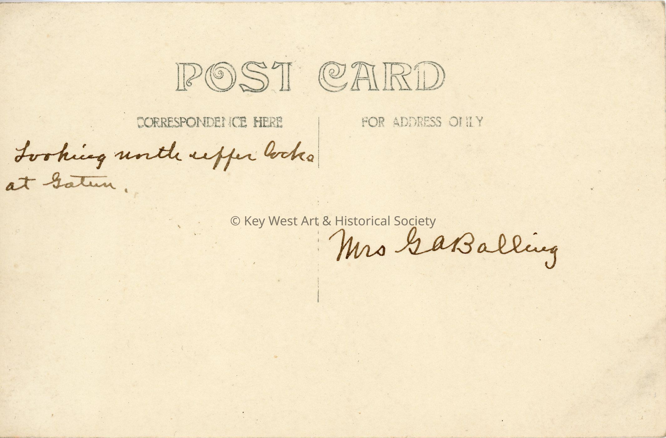 Black and white photograph postcard depicting the construction of the Panama Canal. The photograph is looking north at the two (2) upper locks of the Gatun Locks. The Atlantic Ocean is in the center background. The postcard is addressed to Mrs. G.A. Balling. Verso has a handwritten note.Subject