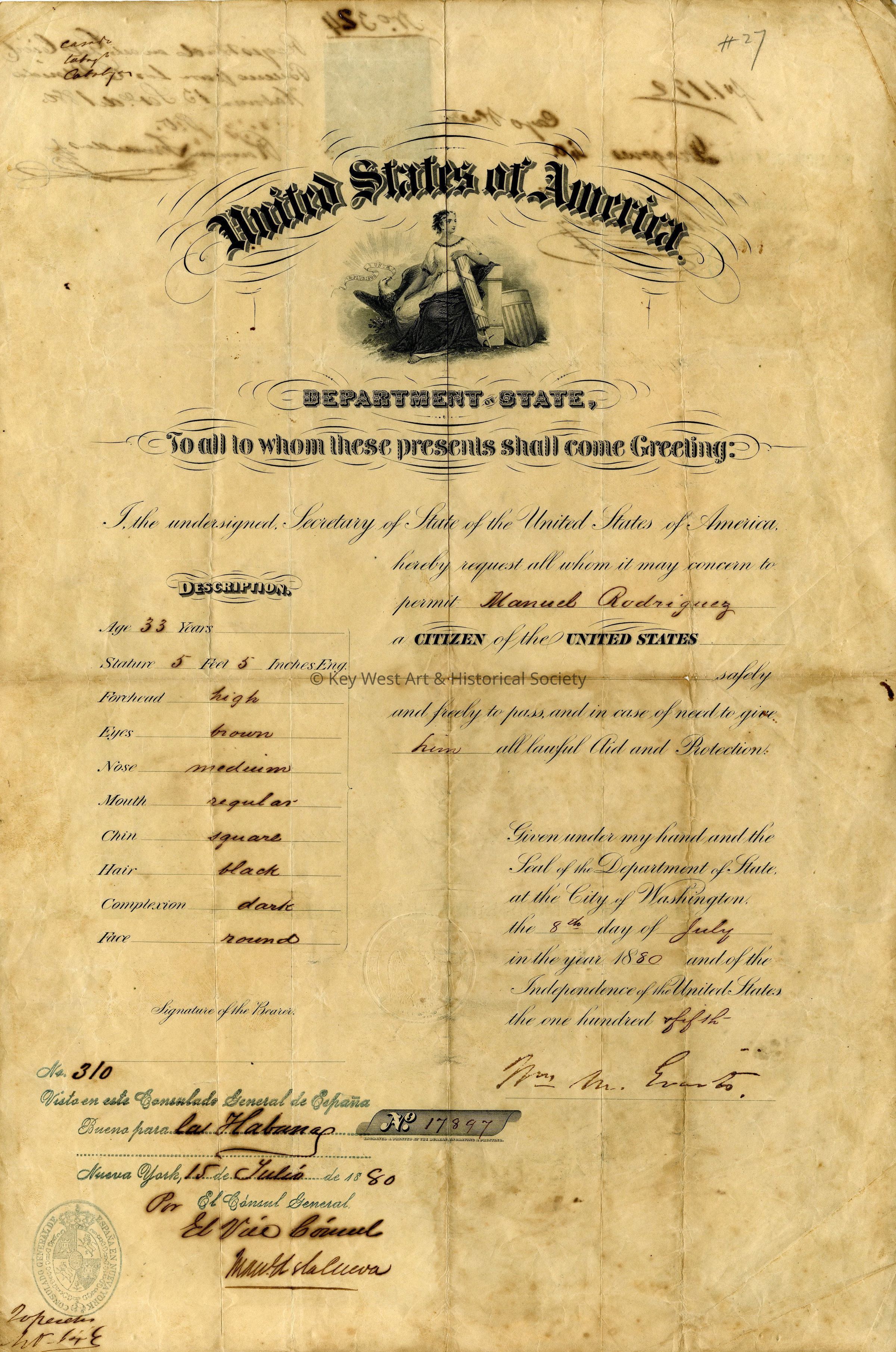 US Citizenship Certificate for Manuel Rodriguez along with all his biometric data.