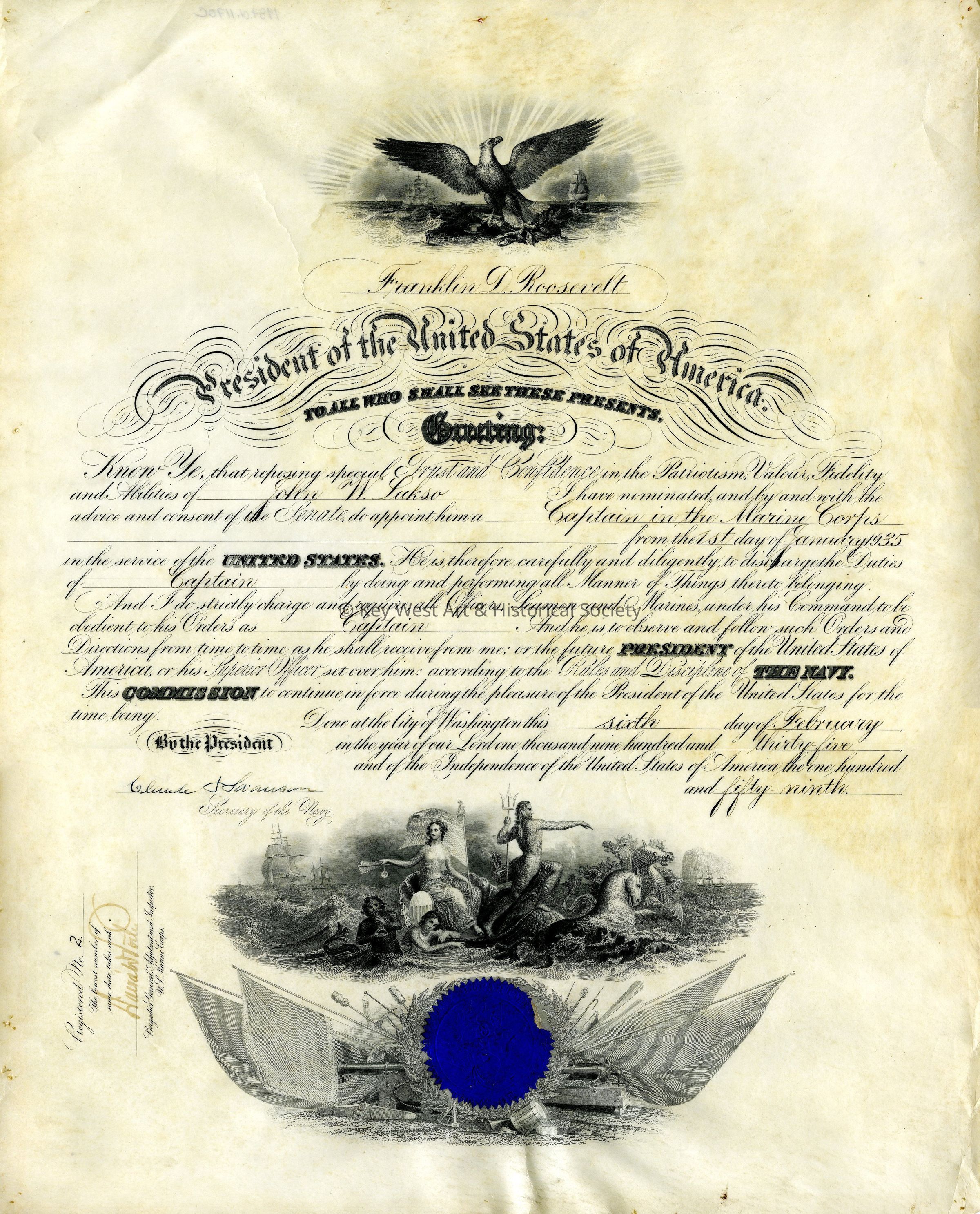 US Marine Corps appointment document issued to John W. Lakso who was appointed a captain. The commission was signed by Claude A. Swanson, Secretary of the Navy.Collection