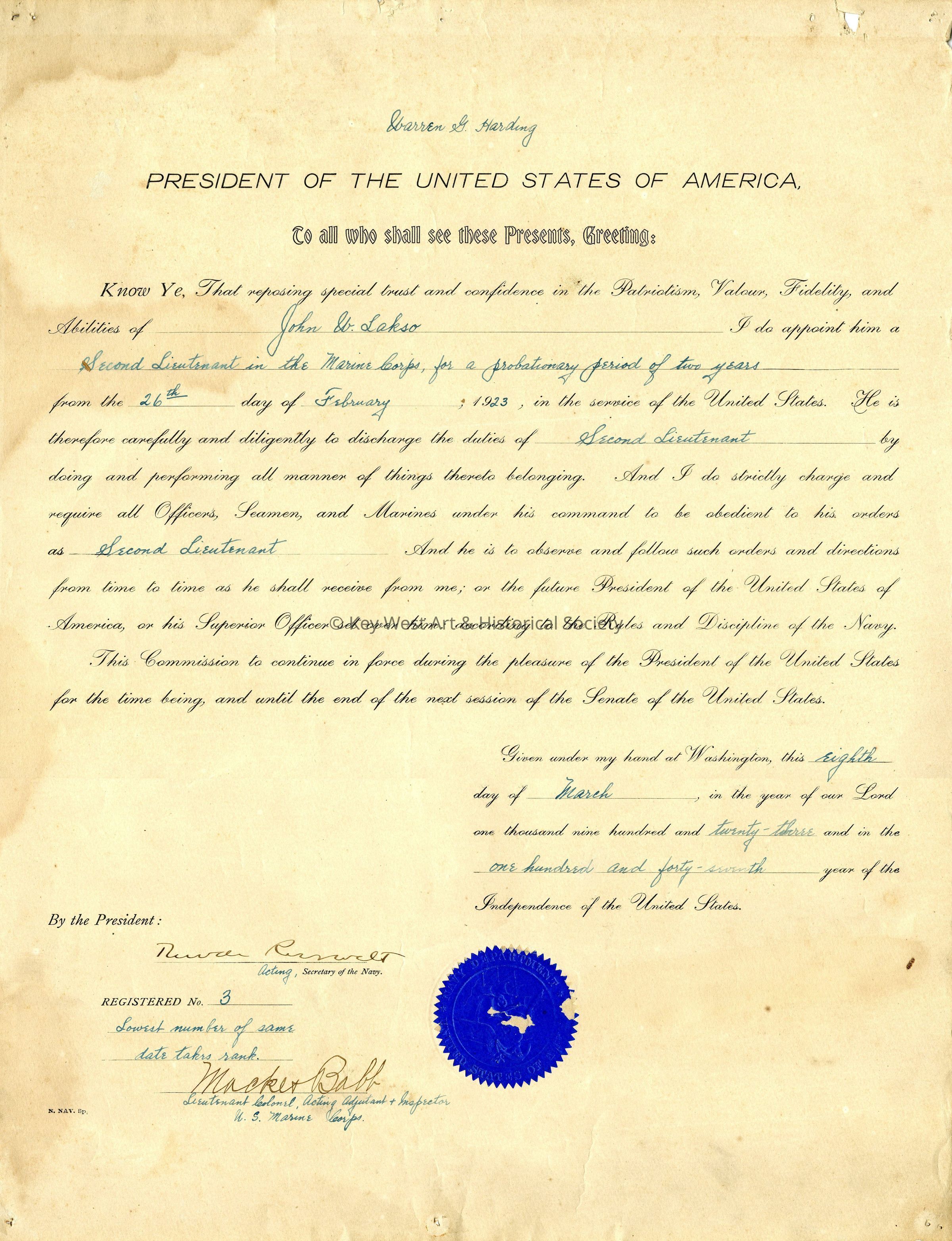 US Marine Corps appointment document issued to John W. Lakso who was appointed a second lieutenant. The commission was signed by Theodore Roosevelt Jr., acting Secretary of the Navy.Collection