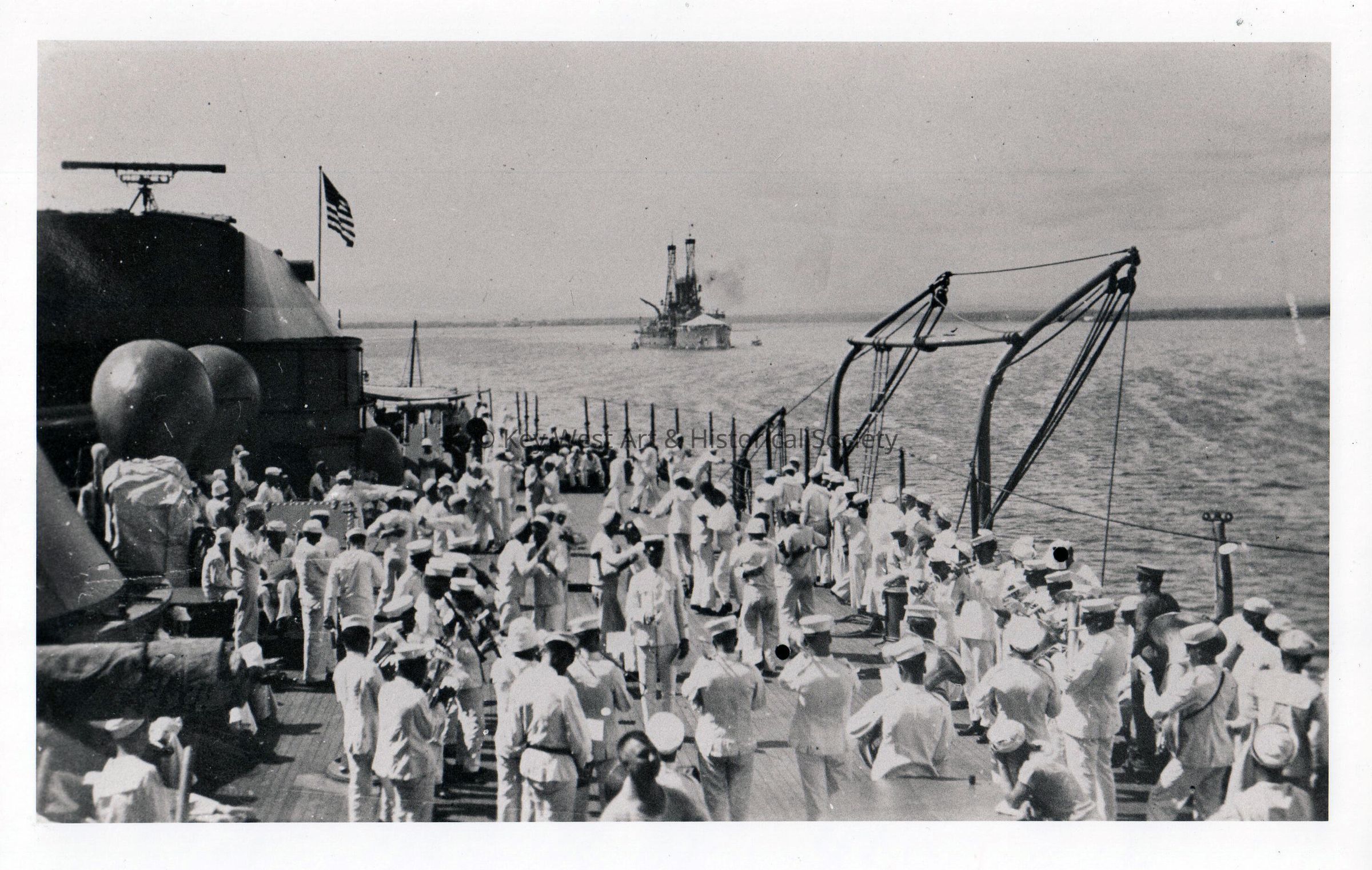 Black and white photograph of U.S. Navy sailors, some with musical instruments, on the deck of an unknown ship.